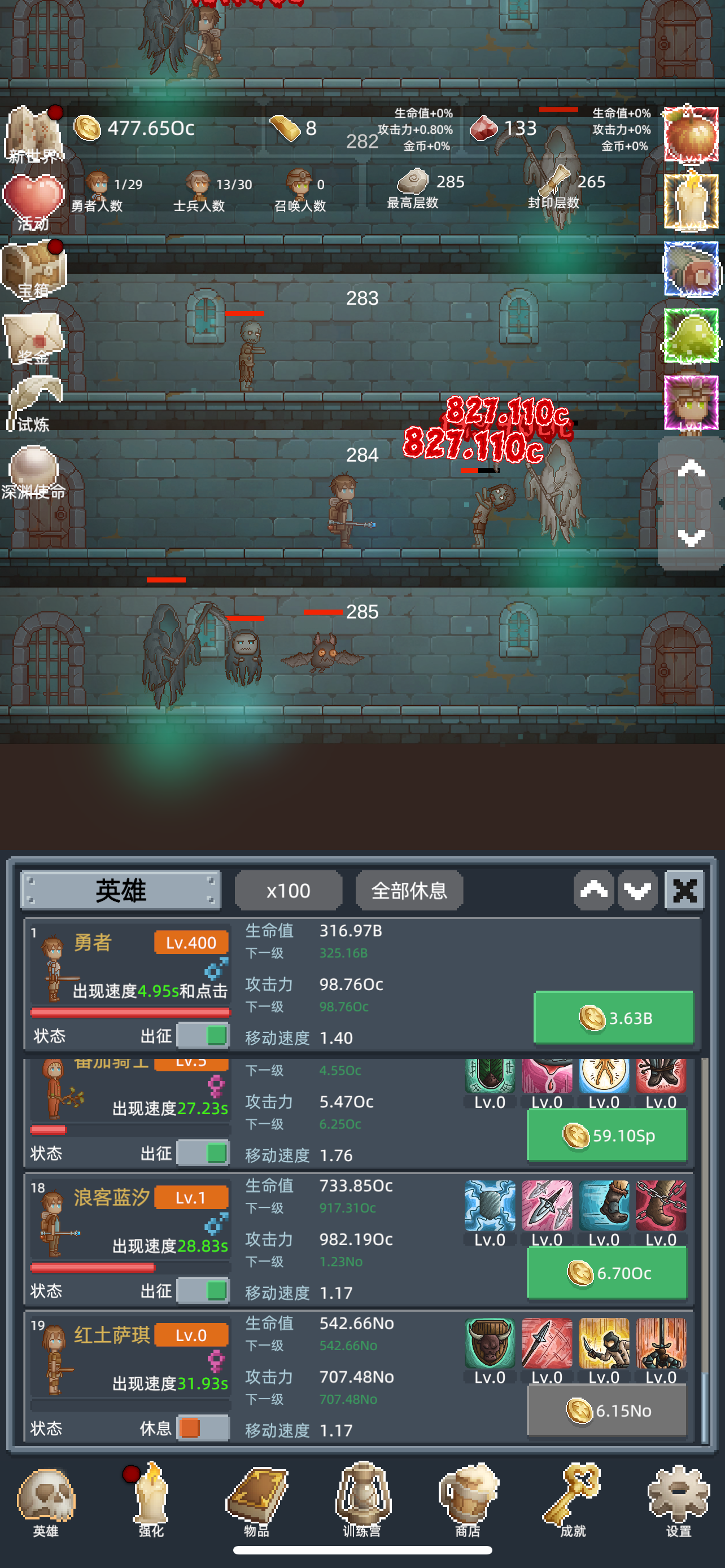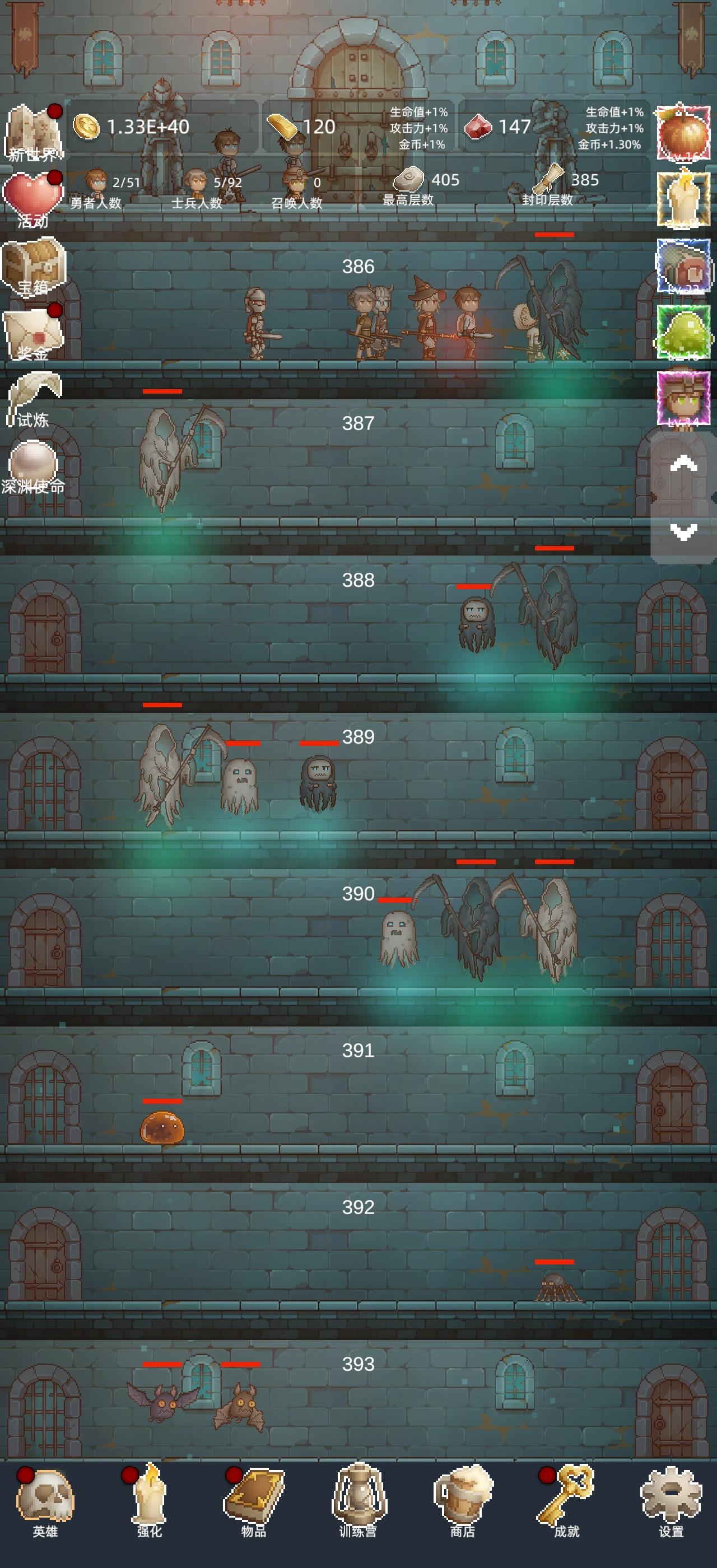 如果卡关了,想冲一下高层的话有三个小技巧。 第一个就是利用时间去堆,不过不要,直接挂机,挂机太慢了,你可以挂个小窗而且可以把游戏重复退出,再进入刷一下宝箱怪。 第二个就是如果玩到后期的话,有些。英雄是升到1000级以后,战力有质的变化的,可以尝试把那些英雄升到1000级。或者等到。能升到2000级的时候,它也会产生质变。 第三个就比较慢了,如果要到高层的话,可能需要自己不断重生,把一些物品的