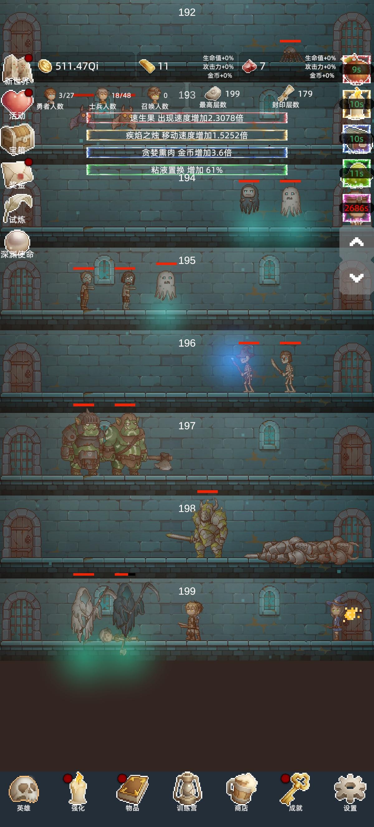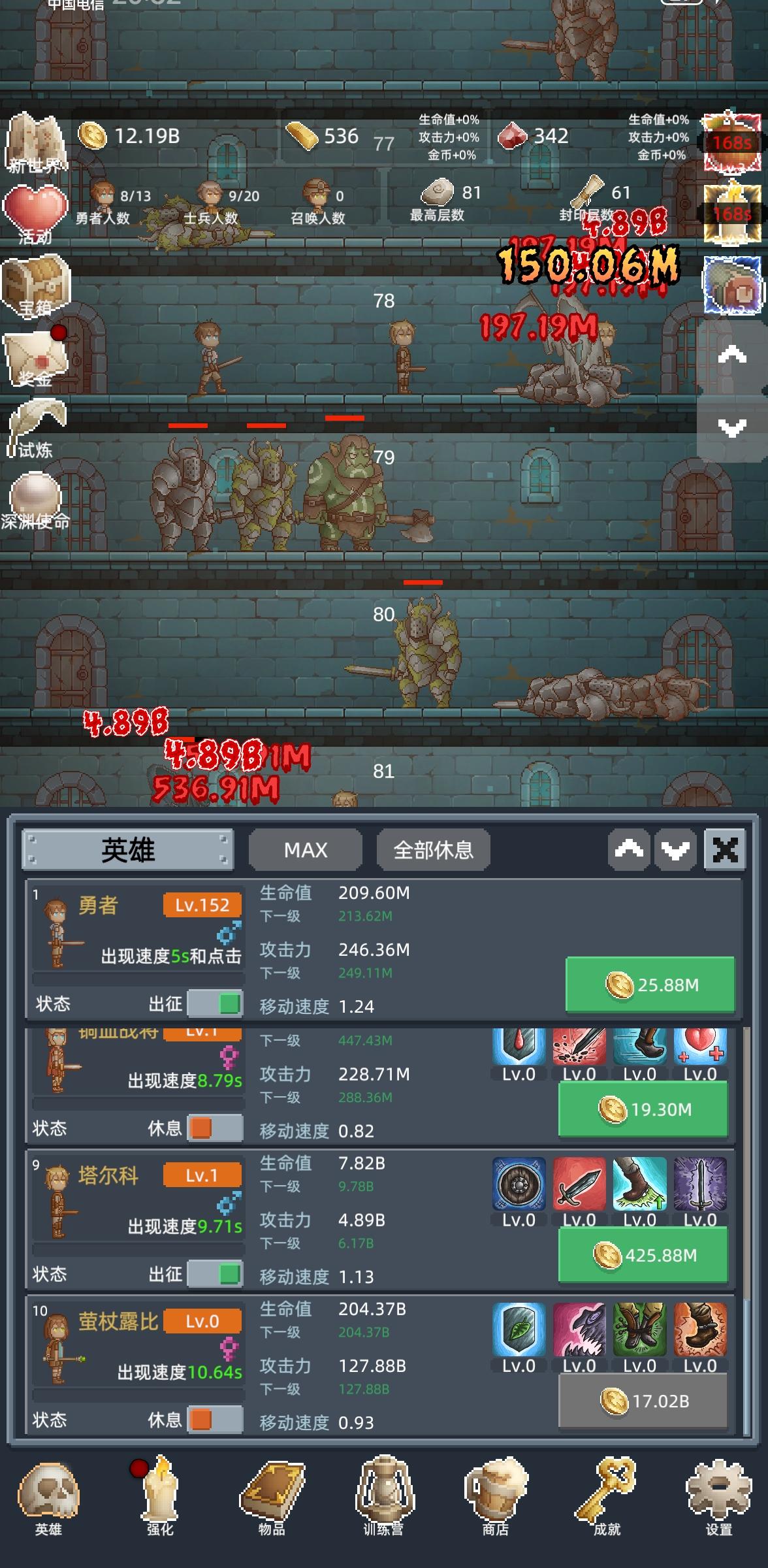 强烈推荐新手不要急着推层,游戏中的重要资源金砖和红宝石的获取都要依靠刷200层以内的试炼先在100层转生3次左右再尝试突破150层突破150层开启试炼后继续在100层快速转生,实力足够了就速刷200层拿试炼奖励刷的过程中可以尝试突破400和600两个关键层卡的太久就转生继续刷200层试炼推到高层拿的珍珠可以拿来换红宝石,但是实际上不如多刷几次试炼拿的红宝石多耐玩度:非常上头的保管好贵重物