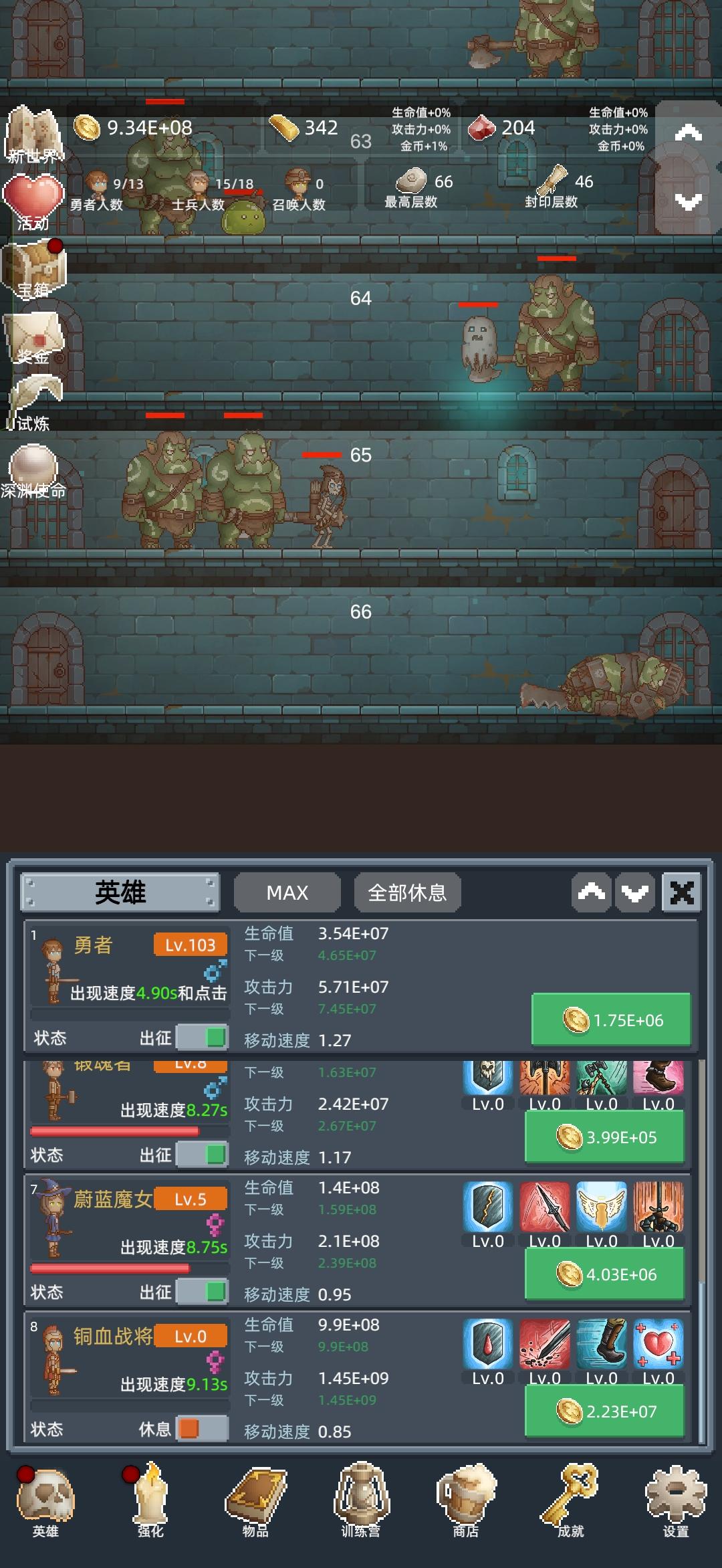 游戏没有内购,花点时间看广告就行前期主要是冲层,土兵每个只升一级,不够钱了就升勇士。勇士100级,500级,1000级会有质变。前三次尽量120层了再转生。可以多个120层的宝箱。第三次了尽量打到150层,可以开试炼。每次转生商店都会重置,利用好冲层有大用。勇者之赐无脑升满!!!