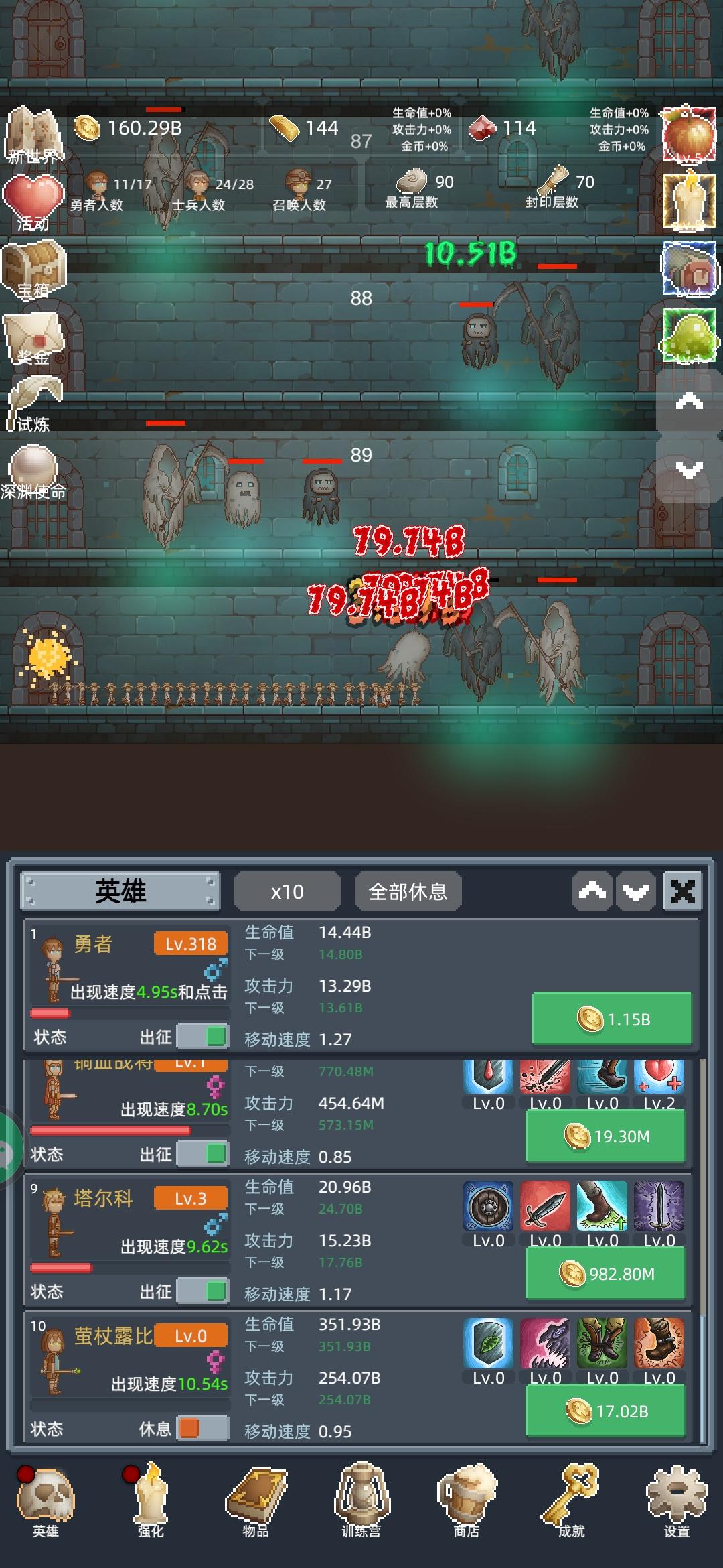 游戏没有内购,花点时间看广告就行前期主要是冲层,土兵每个只升一级,不够钱了就升勇士。勇士100级,500级,1000级会有质变。前三次尽量120层了再转生。可以多个120层的宝箱。第三次了尽量打到150层,可以开试炼。每次转生商店都会重置,利用好冲层有大用。勇者之赐无脑升满!!!
