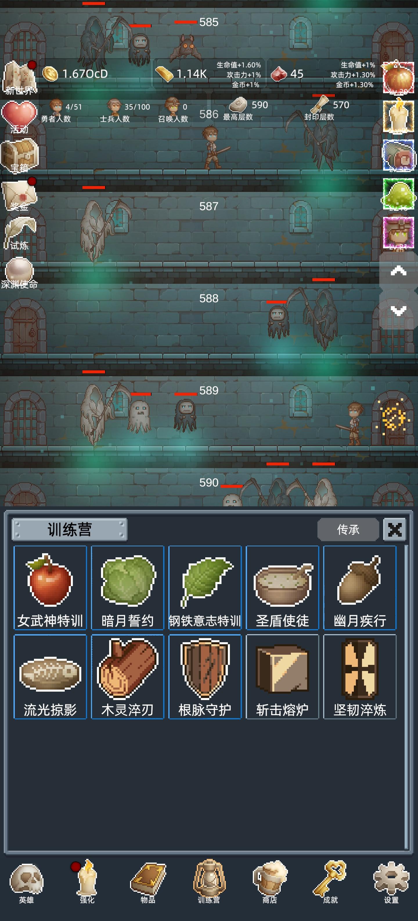 这游戏好玩的,一口气玩了好久,简单分享一下自己的想法。左上角信封的广告奖励尽量拿完,每次进新世界可以在商店升级5次勇者之赐,加属性的,需要用金砖。金砖用来升勇者之赐就行。金币的花费我是除了开新士兵之外,主要升级勇者。点出强化里的战阵结晶之后,勇者能高频率召唤,主要推层就靠这个。