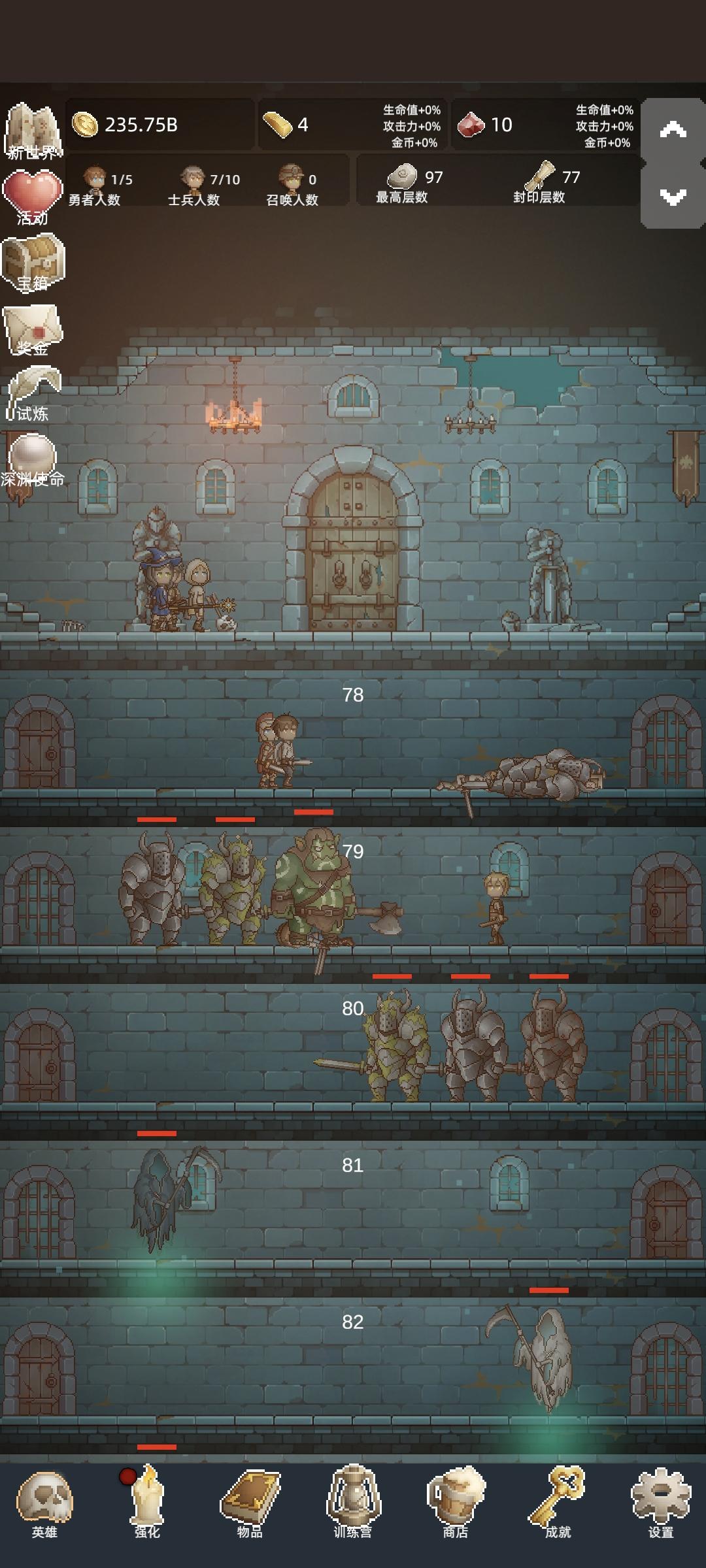 在最开始的时候这游戏玩着会有点迷,但中后期基本按照自己节奏走就行了没有说特定流派才能玩,所以这是纯萌新攻略。开局勇者直接升就行了剩下的士兵点一级解锁就行但有几个节点英雄(卡关是不想肝可以多点几级)赛勒斯,锻魂者,塔尔科。如果在冲关的时候遇到与自己极限层级相近的宝箱怪可以去刷收益会比你推个几关要高一点,第一次转生最后的两个莹仗露比和戴维琼斯如果你比较肝或者使用连点器露比不用升级,只需要升级戴维琼斯
