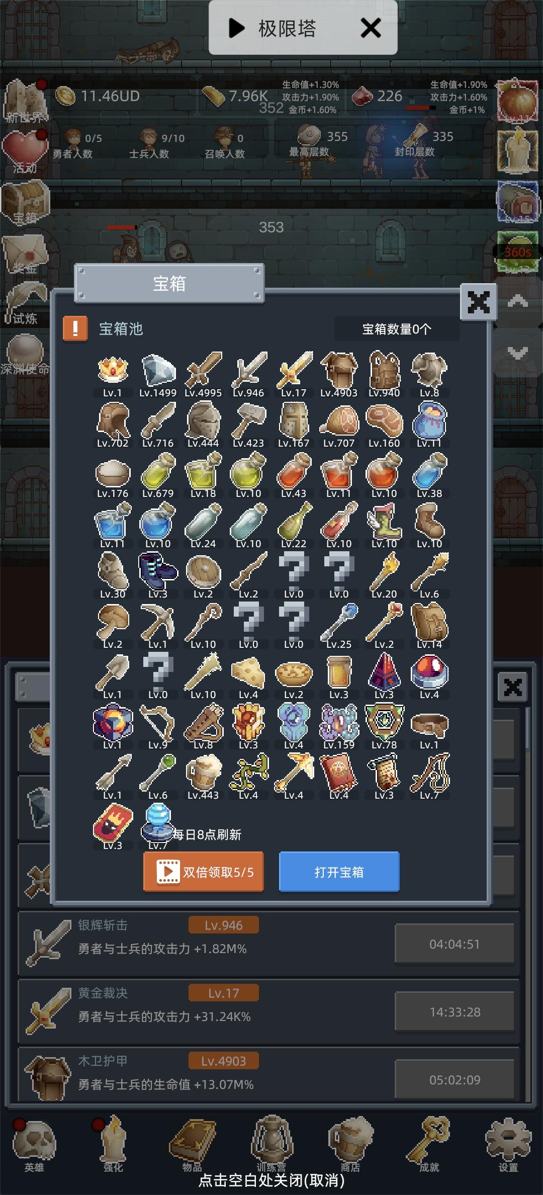 游戏没有内购,花点时间看广告就行 可以立马取消拿奖励,前期主要是冲层,土兵每个只升一级,不够钱了就升勇士。勇士100级,500级,1000级会有质变。 前三次尽量120层了再转生。可以多个120层的宝箱。第三次了尽量打到150层,可以开试炼。每次转生商店都会重置,利用好冲层有大用。勇者之赐无脑升满!!!