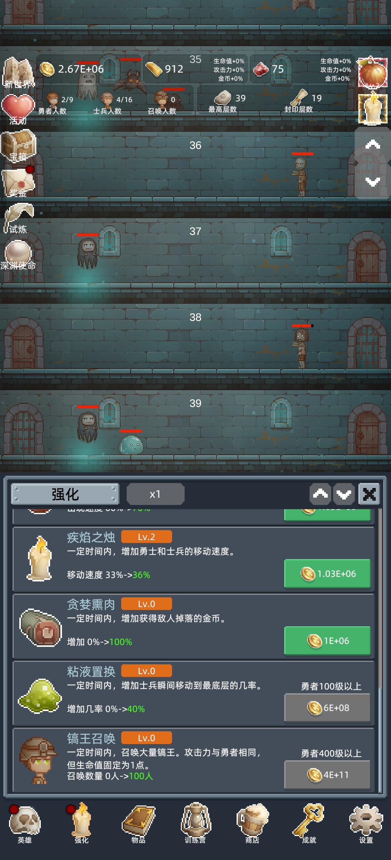 游戏没有内购,花点时间看广告就行 可以立马取消拿奖励,前期主要是冲层,土兵每个只升一级,不够钱了就升勇士。勇士100级,500级,1000级会有质变。 第三次了尽量打到150层,可以开试炼。每次转生商店都会重置,利用好冲层有大用。勇者之赐无脑升满!!!