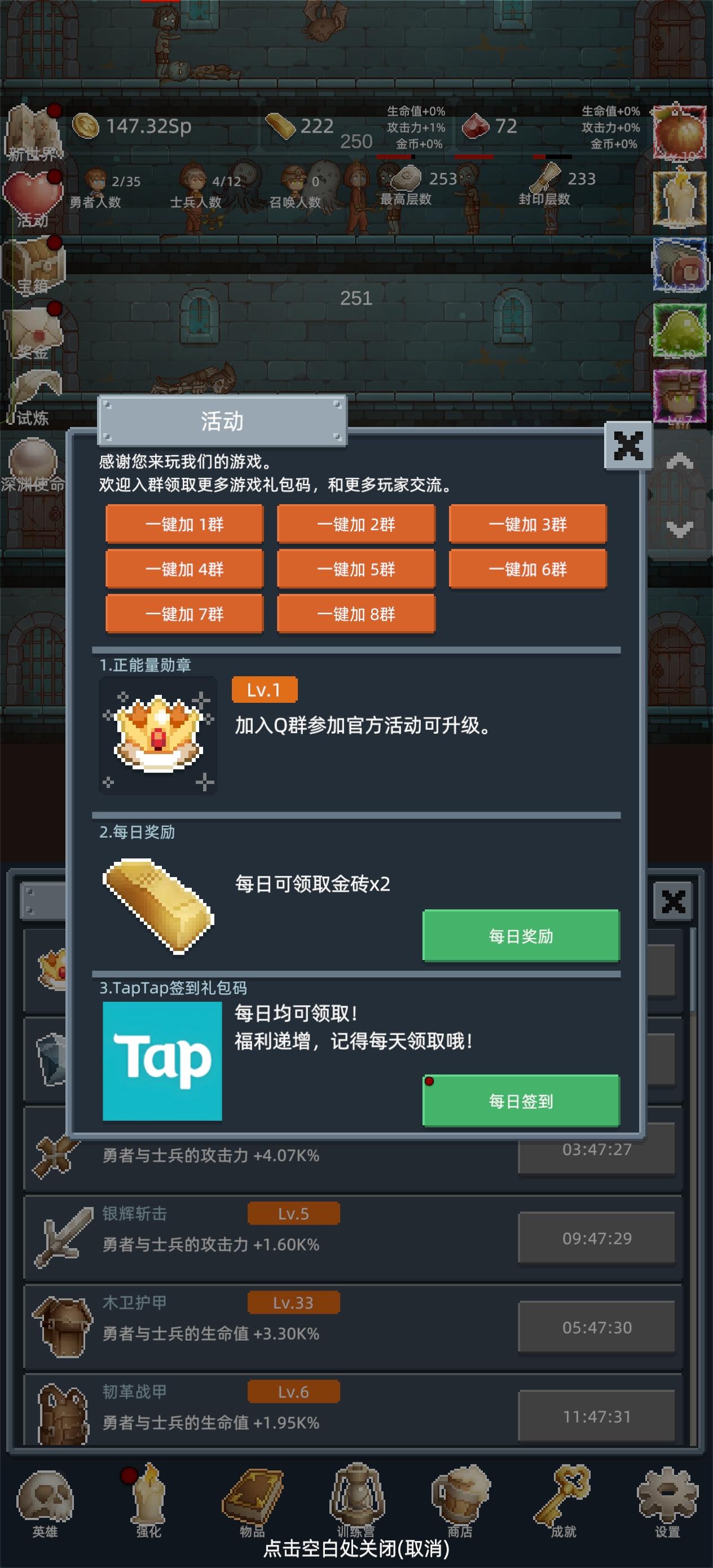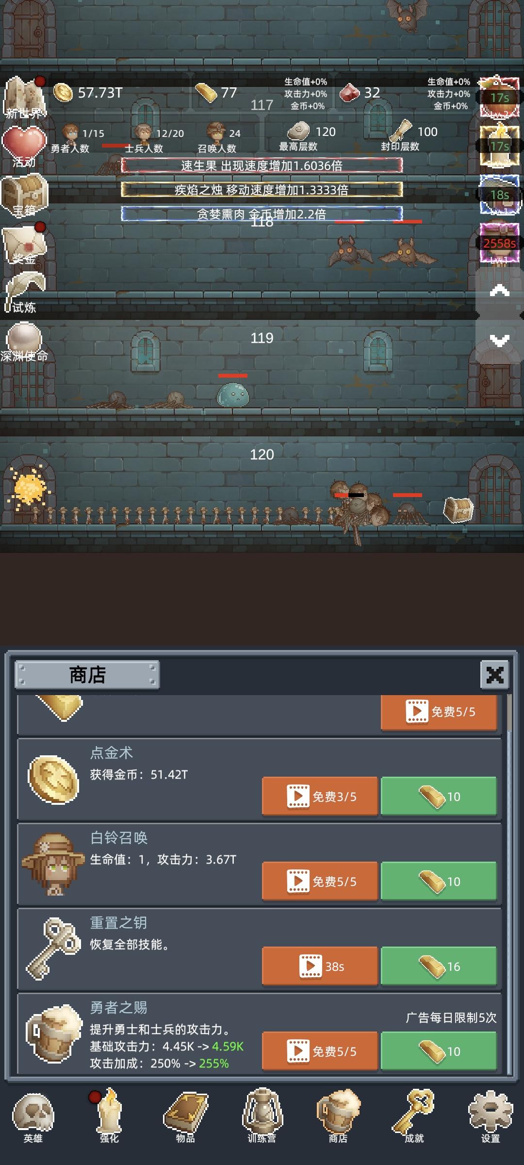 进游戏之后第一件事,把所有能找到的礼包码领了,然后商店购买最下面的勇者之赐,这个东西越多越好,宝石留着升训练营的永久传承,这个需要极多的红宝石。第一次进入打到100层之后凑10T转生,没必要继续打,在转生两三次之后试着打到150,开启试炼。前期大概就是勇者+白玲的打法,开局只升级勇者,用勇者尽量往后推,等勇者的攻击不足把怪物秒杀后开白玲,利用点金术和白玲尽量拿试炼奖励。勇者升级到110之后可