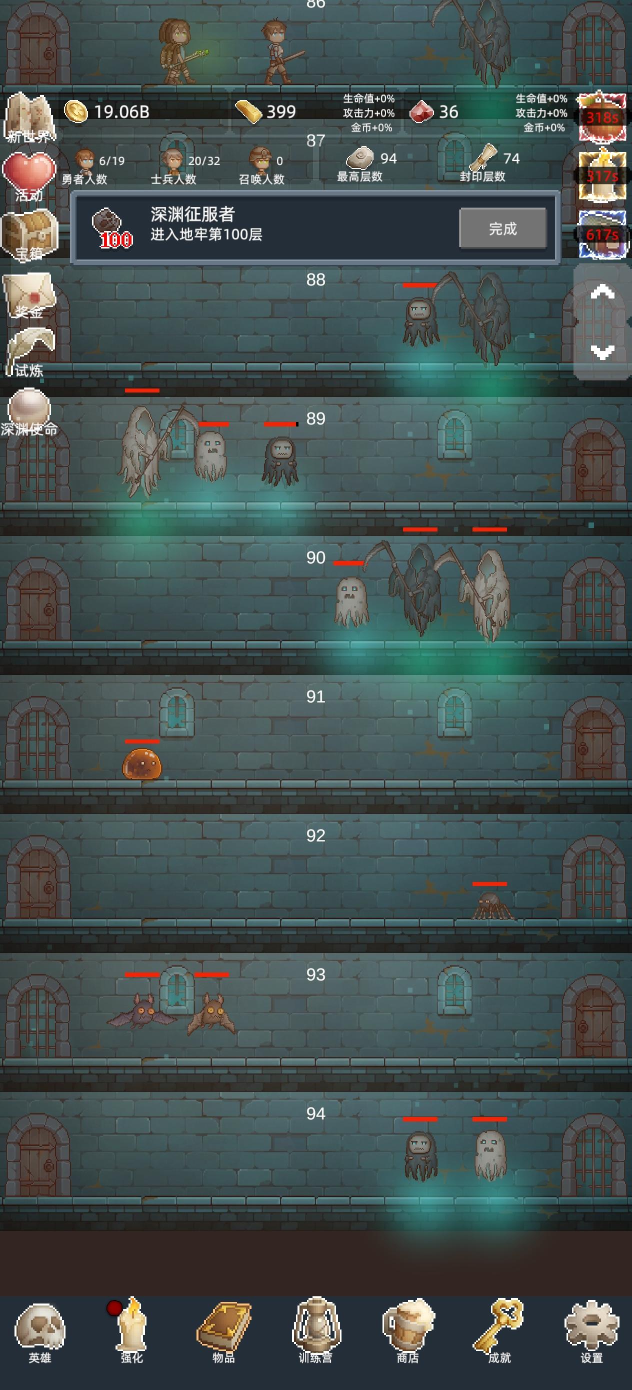 进游戏之后第一件事,把所有能找到的礼包码领了,然后商店购买最下面的勇者之赐,这个东西越多越好,宝石留着升训练营的永久传承,这个需要极多的红宝石。 第一次进入打到100层之后凑10T转生,没必要继续打,在转生两三次之后试着打到150,开启试炼。 前期大概就是勇者+白玲的打法,开局只升级勇者,用勇者尽量往后推,等勇者的攻击不足把怪物秒杀后开白玲,利用点金术和白玲尽量拿试炼奖励。 勇者升级到110
