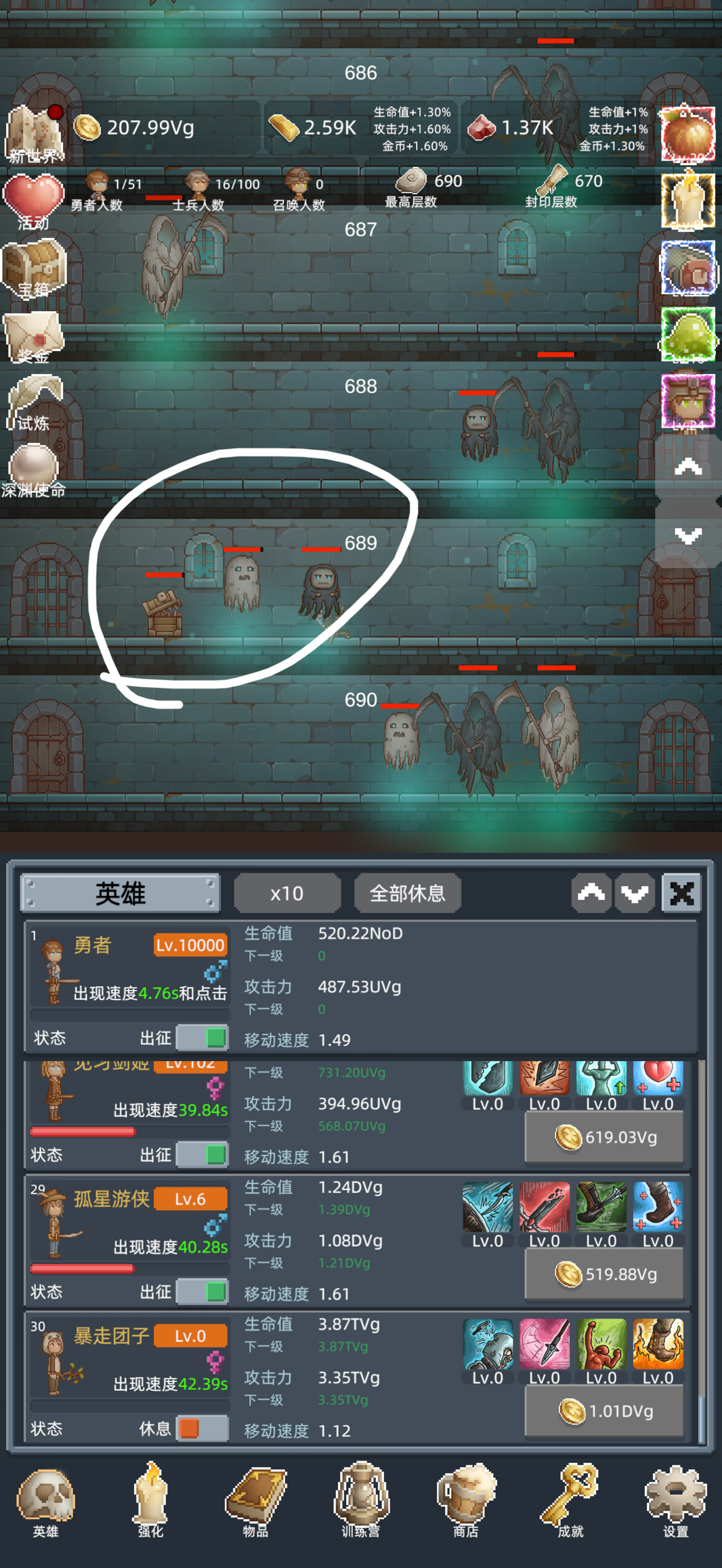 进游戏之后第一件事,把所有能找到的礼包码领了,然后商店购买最下面的勇者之赐,这个东西越多越好,宝石留着升训练营的永久传承,这个需要极多的红宝石。第一次进入打到100层之后凑10T转生,没必要继续打,在转生两三次之后试着打到150,开启试炼。前期大概就是勇者+白玲的打法,开局只升级勇者,用勇者尽量往后推,等勇者的攻击不足把怪物秒杀后开白玲,利用点金术和白玲尽量拿试炼奖励。勇者升级到110之后可