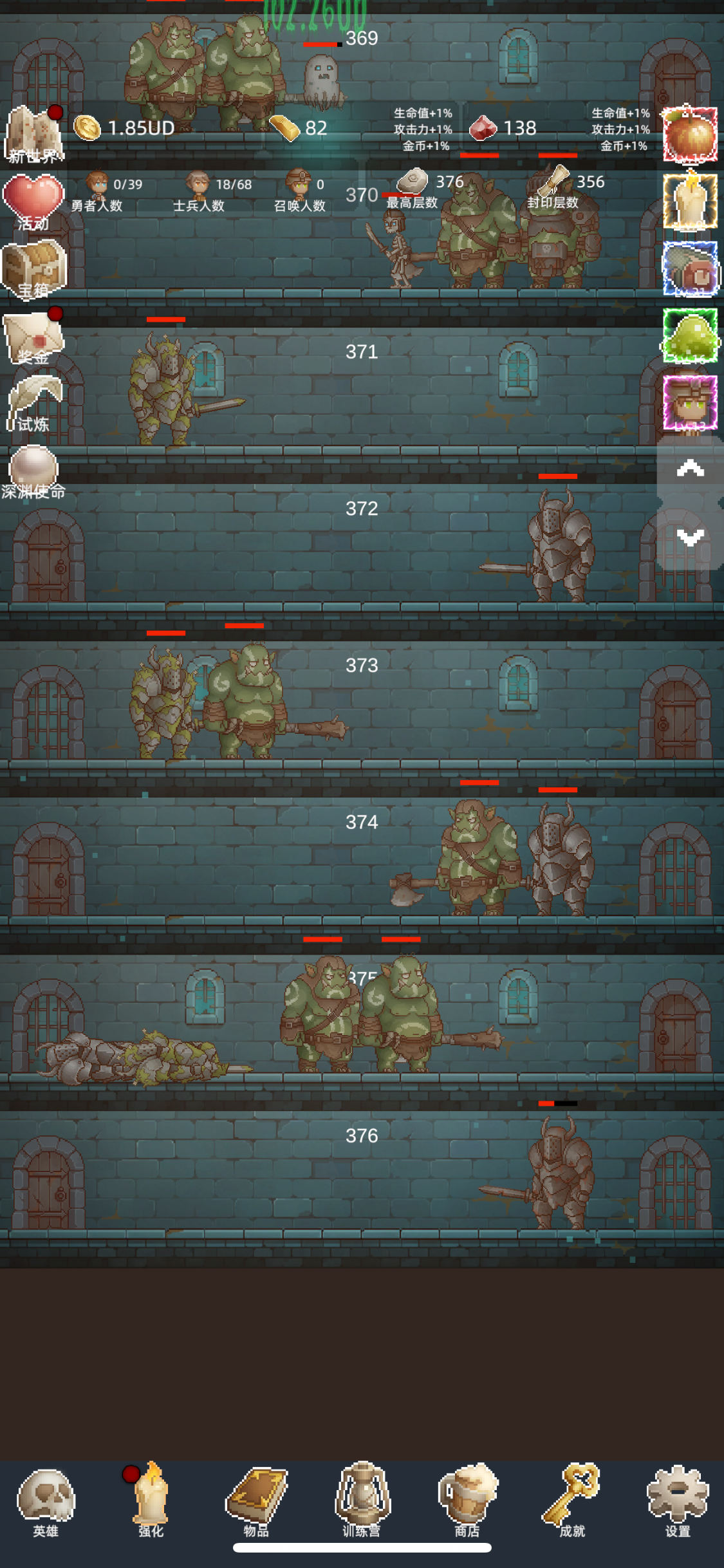 在前3次重生前不需要特意升级勇者,开新佣兵推层更快,佣兵可以适当升级,只要升级花费的金币不超过开新佣兵的十分之一就行。商店加属性的酒买满,其他的冲关时候才建议买。转生三次后争取刷到150层,之后的每次重生都会开启试炼,在限定的时间内推到目标层数,会有不少奖励。每个10的倍数层都有几率刷出宝箱,前期就是不停的重生试炼刷宝箱,商店的东西除了加属性的酒,其他的每次重生都会刷新,白玲推层很强,搭配强化