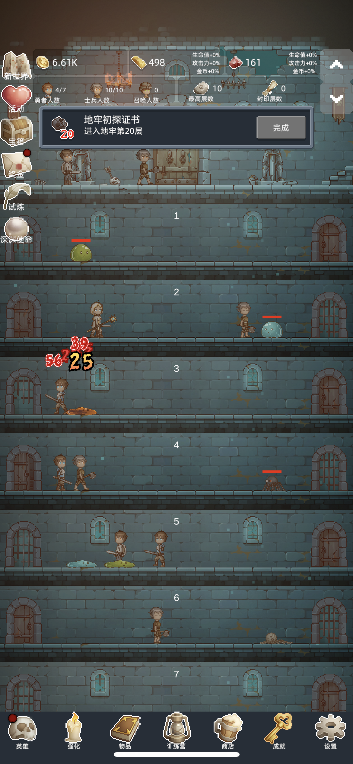 在前3次重生前不需要特意升级勇者,开新佣兵推层更快,佣兵可以适当升级,只要升级花费的金币不超过开新佣兵的十分之一就行。商店加属性的酒买满,其他的冲关时候才建议买。转生三次后争取刷到150层,之后的每次重生都会开启试炼,在限定的时间内推到目标层数,会有不少奖励。每个10的倍数层都有几率刷出宝箱,前期就是不停的重生试炼刷宝箱,商店的东西除了加属性的酒,其他的每次重生都会刷新,白玲推层很强,搭配强化