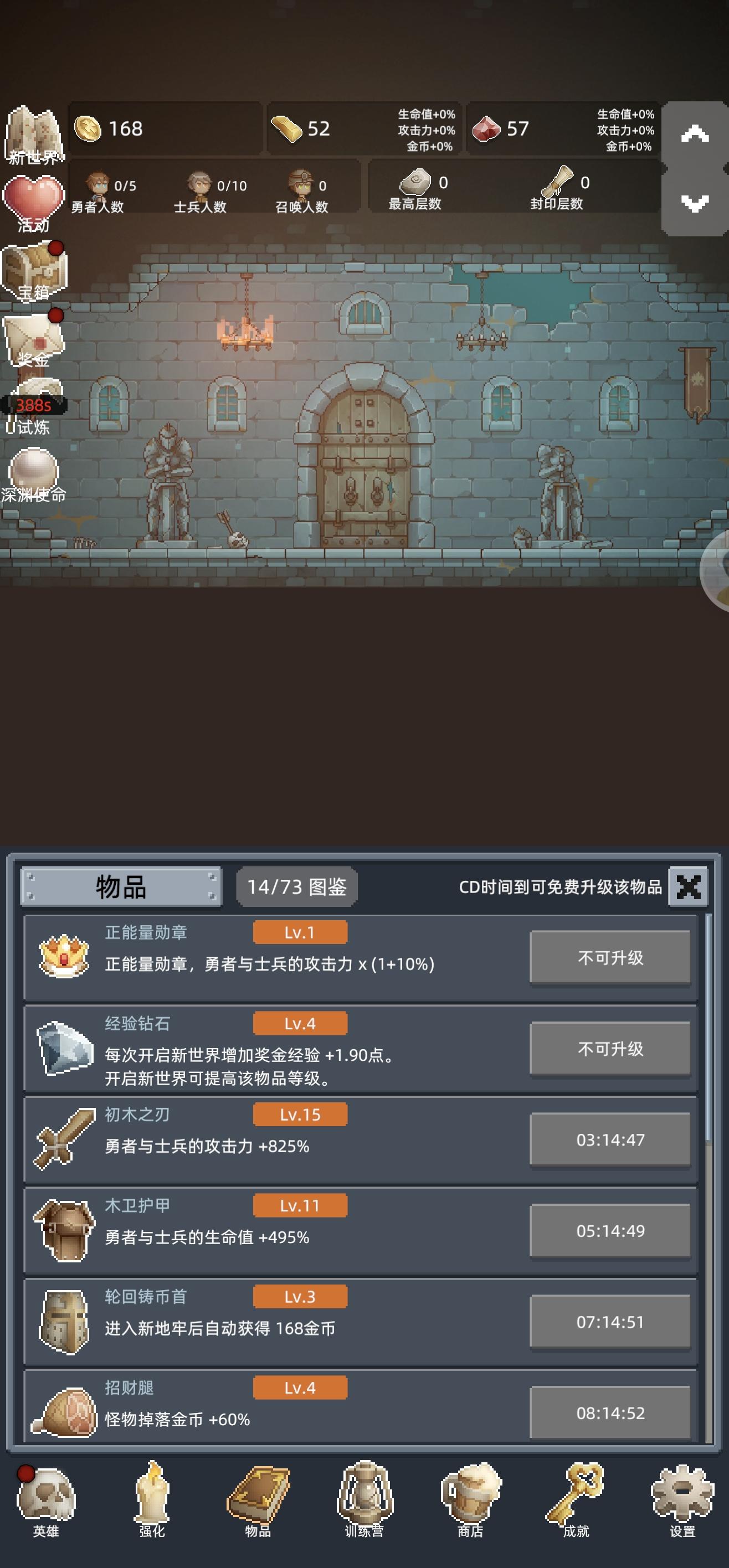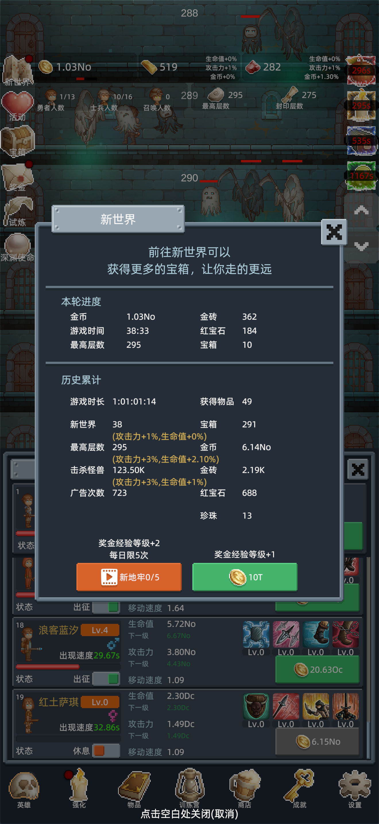 核心原则:拒绝熬关,短平快转生 新手最容易踩的坑就是死磕关卡,其实游戏核心玩法是“转生叠buff”:每轮转生控制在30-55分钟,比硬磨105关效率高10倍 。前3转不用追求高层数,100-105关攒够10T金币就直接转生,重点拿“勇者恩赐”的永久属性加成,越转战力越猛。