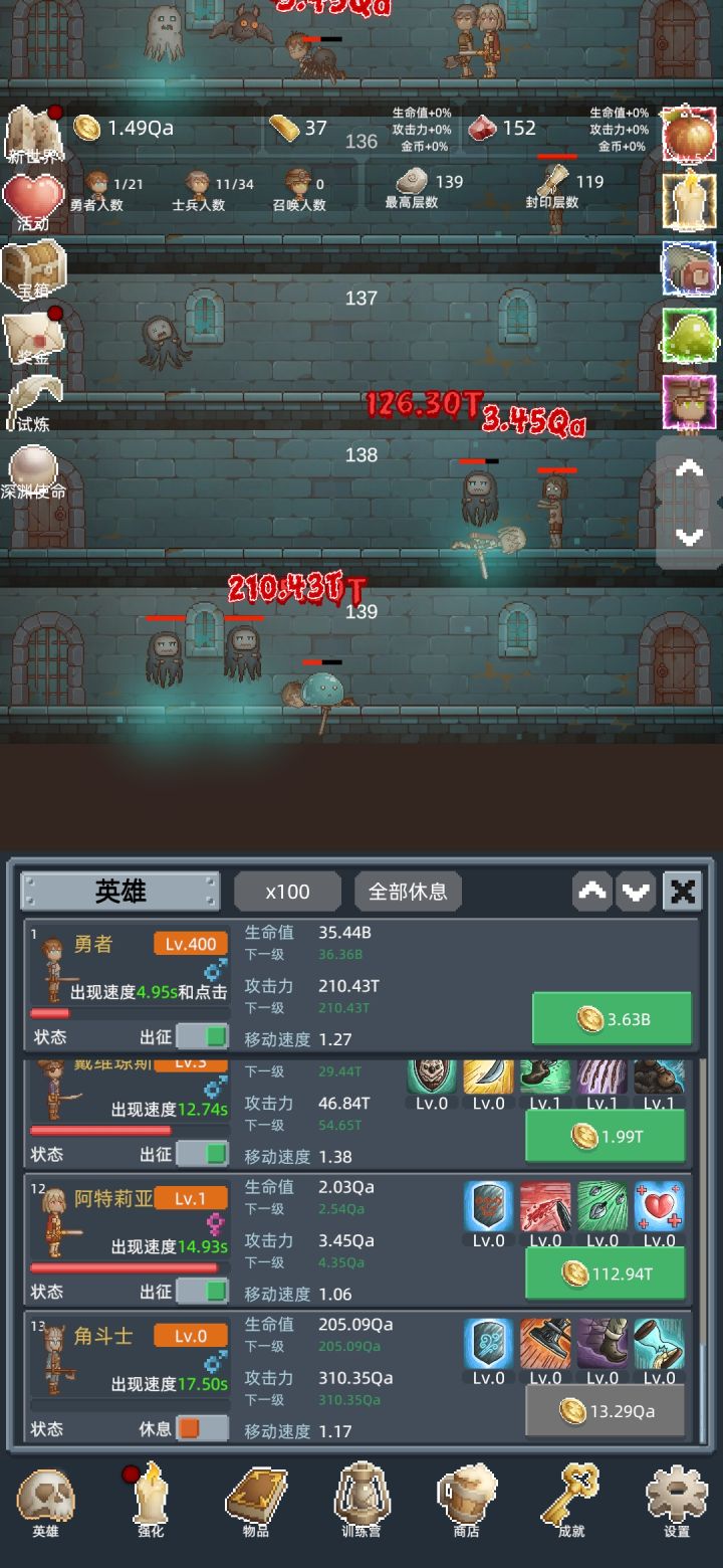 玩了一段时间,发现前期就得无脑转生,转生的收益属于比较可观的。不过在此之前,先开个150层的试炼,之后就可以10t转生了。