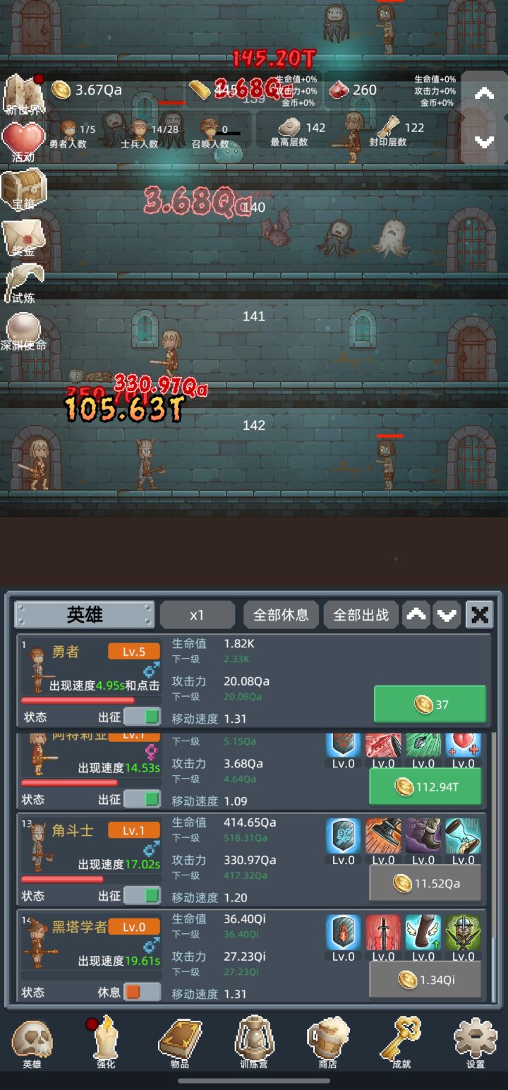 转生次数越多越强,整体体验挺不错。像素画风但形象鲜明,玩法挺肝,自动战斗+挂机养成,上班摸鱼、通勤打发时间都很合适。 游戏没有强制广告,也不逼氪,零氪爽玩。阵容搭配、转生养成有一定策略性,不是无脑点点点,越玩越有成就感。 而且刷点很高,适合收集癖玩家,多次转生也不会感到腻味,休闲解压首选。