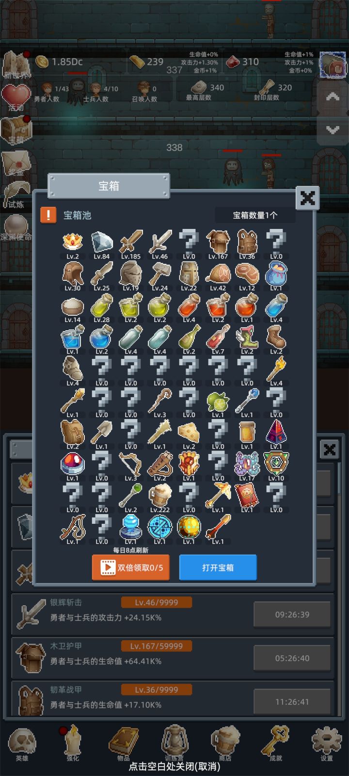 转生爬塔就可以获得箱子,不停的开箱子就行了,也不用充钱,每天就看十多个广告就行,养老游戏
