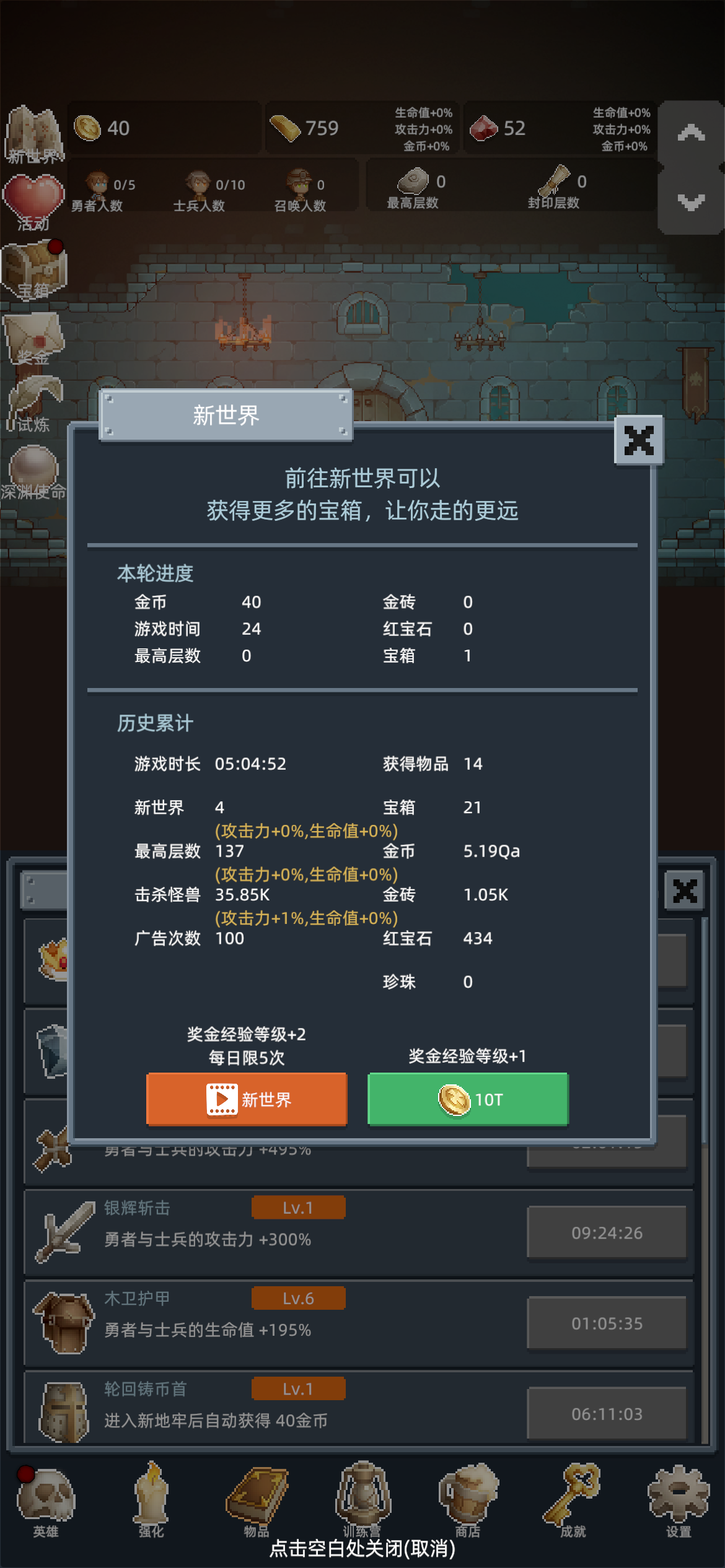 进游戏之后第一件事,把所有能找到的礼包码领了,然后商店购买最下面的勇者之赐,这个东西越多越好,宝石留着升训练营的永久传承,这个需要极多的红宝石。第一次进入打到100层之后凑10T转生,没必要继续打,在转生两三次之后试着打到150,开启试炼。前期大概就是勇者+白玲的打法,开局只升级勇者,用勇者尽量往后推,等勇者的攻击不足把怪物秒杀后开白玲,利用点金术和白玲尽量拿试炼奖励。勇者升级到110之后可