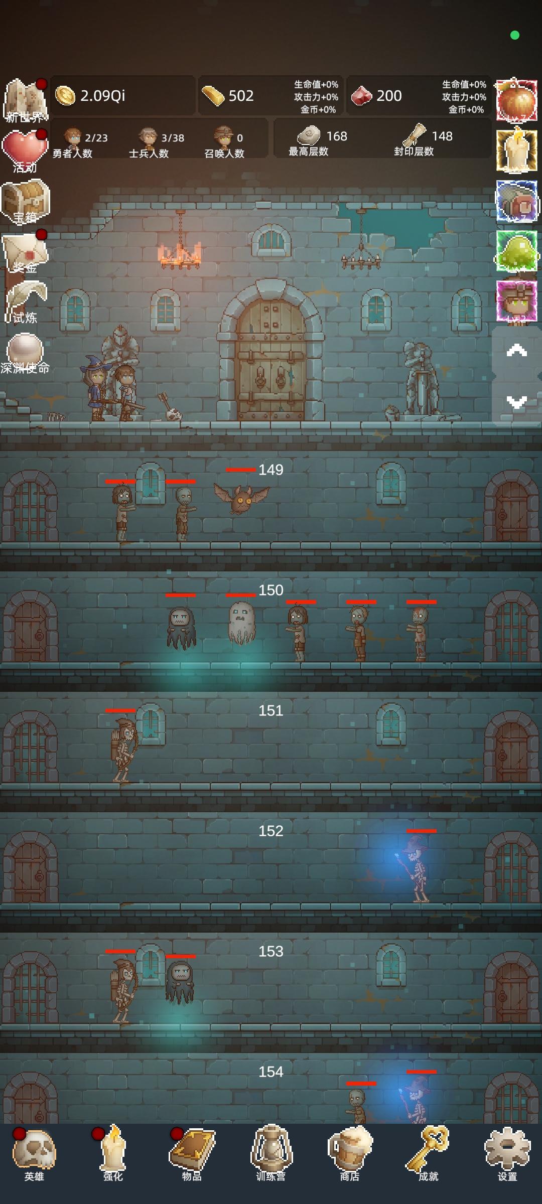 进游戏之后第一件事,把所有能找到的礼包码领了,然后商店购买最下面的勇者之赐,这个东西越多越好,宝石留着升训练营的永久传承,这个需要极多的红宝石。第一次进入打到100层之后凑10T转生,没必要继续打,在转生两三次之后试着打到150,开启试炼。前期大概就是勇者+白玲的打法,开局只升级勇者,用勇者尽量往后推,等勇者的攻击不足把怪物秒杀后开白玲,利用点金术和白玲尽量拿试炼奖励。勇者升级到110之后可