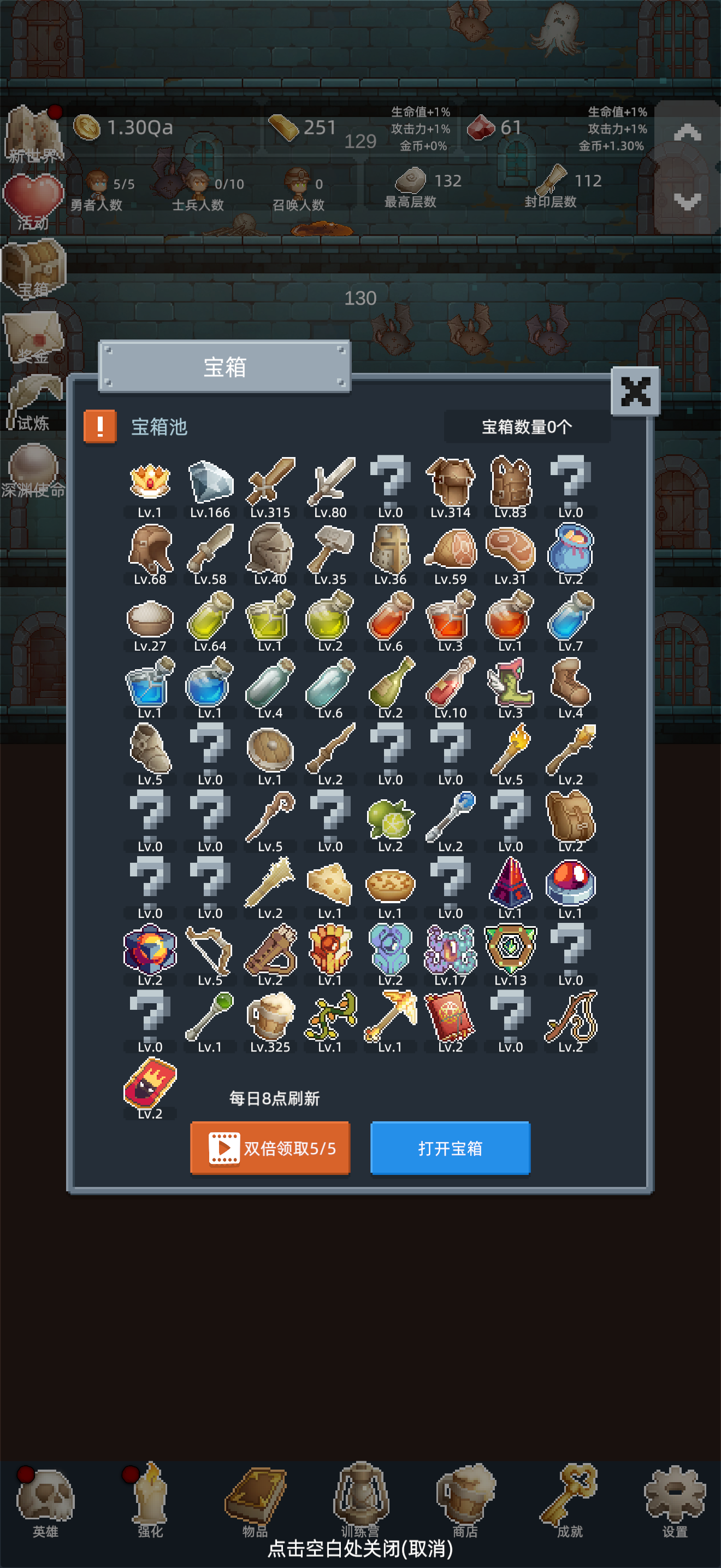 进游戏之后第一件事,把所有能找到的礼包码领了,然后商店购买最下面的勇者之赐,这个东西越多越好,宝石留着升训练营的永久传承,这个需要极多的红宝石。第一次进入打到100层之后凑10T转生,没必要继续打,在转生两三次之后试着打到150,开启试炼。前期大概就是勇者+白玲的打法,开局只升级勇者,用勇者尽量往后推,等勇者的攻击不足把怪物秒杀后开白玲,利用点金术和白玲尽量拿试炼奖励。勇者升级到110之后可