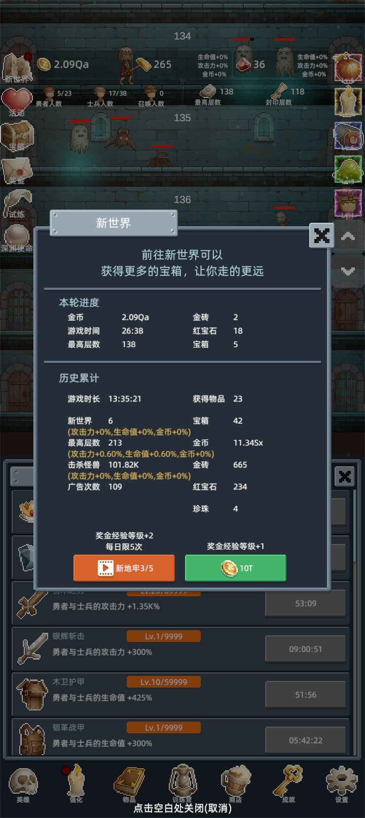 #发现好游戏 刷到100层立马进新世界,转几次以后开试炼,然后就慢慢刷红宝石,记得每天过一百层后到深渊领珍珠,然后就慢慢刷,士兵过了1000后攻击力会大幅提升,但是要好多钱,后期我就主升勇士了,感觉花的钱比士兵少,而且有一层层推的快感。