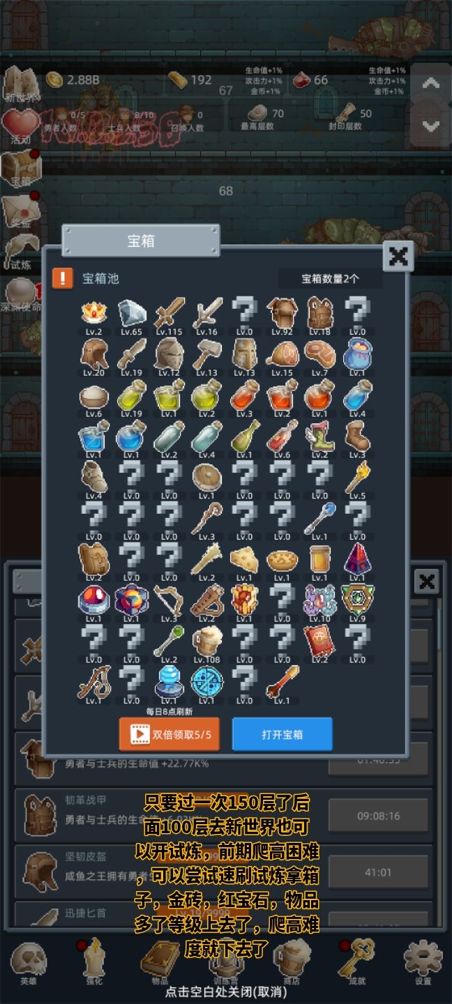 只要过一次150层了后面100层去新世界也可以开试炼,前期爬高困难,可以尝试速刷试炼拿箱子,金砖,红宝石,物品多了等级上去了,爬高难度就下去了