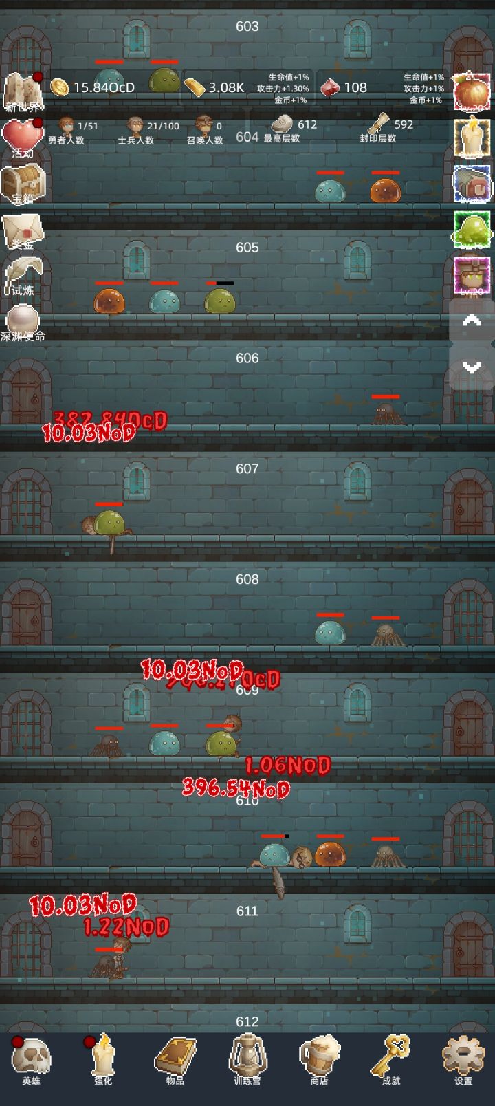 切到科学计数法看勇者攻击力,规律是勇者攻击力XE+Y,就能靠勇者推到10Y+X层比如我目前是5.1E+44,大约能推到445层,445层开始推起来就会很艰难