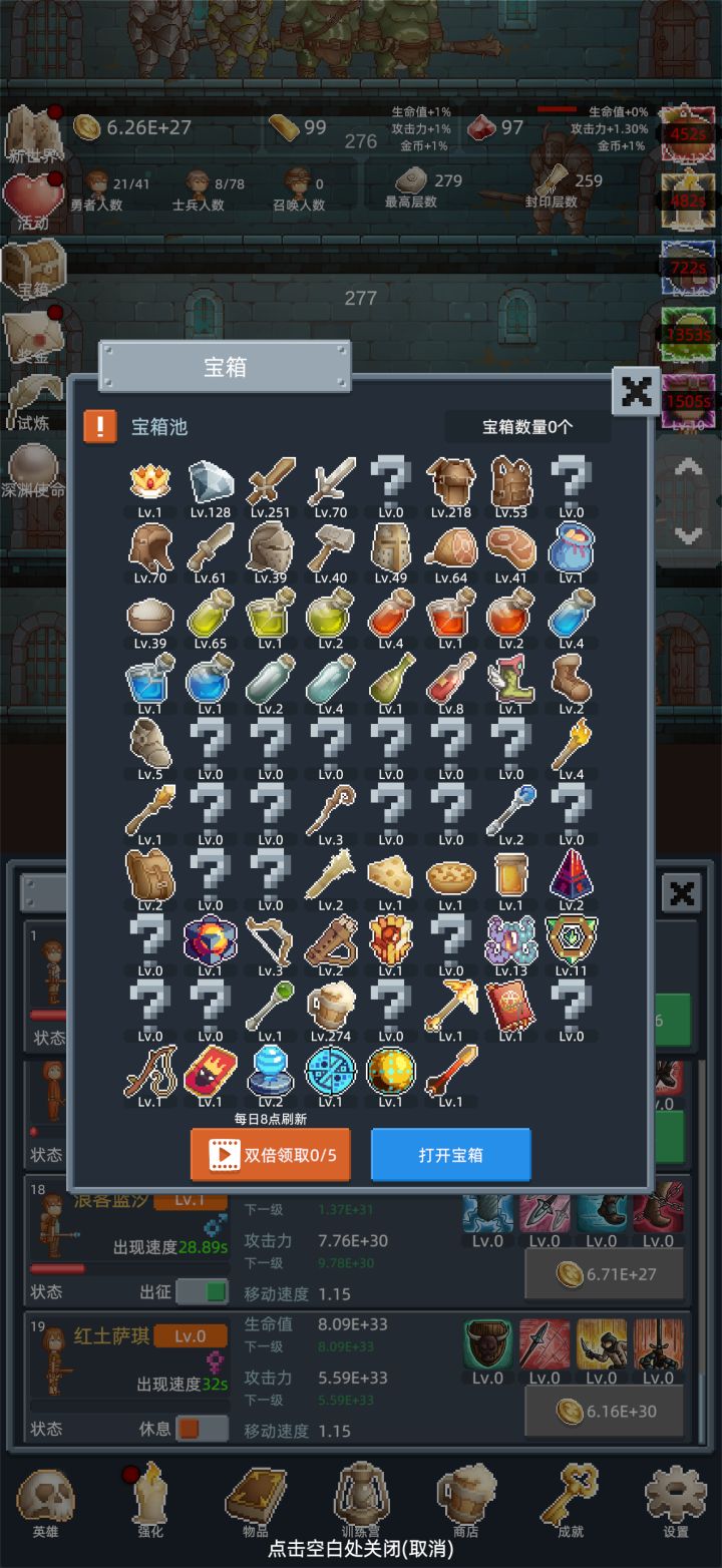 刚进游戏就被复古的像素画风戳中了,地牢的砖墙、像素化的英雄与怪物、宝箱里的装备图标,每一处都透着满满的怀旧感,瞬间把人拉回小时候玩像素游戏的快乐里。最让我惊喜的是放置挂机的核心玩法,完全不用肝:哪怕离线,勇者们也会自动在地牢里闯关、刷怪、攒金币,上线就能收获一堆资源,对上班族和休闲玩家太友好了。哪怕只是挂着,看着勇者人数一点点上涨、最高层数不断刷新,都有种满满的成就感。•装备系统更是亮点满满,