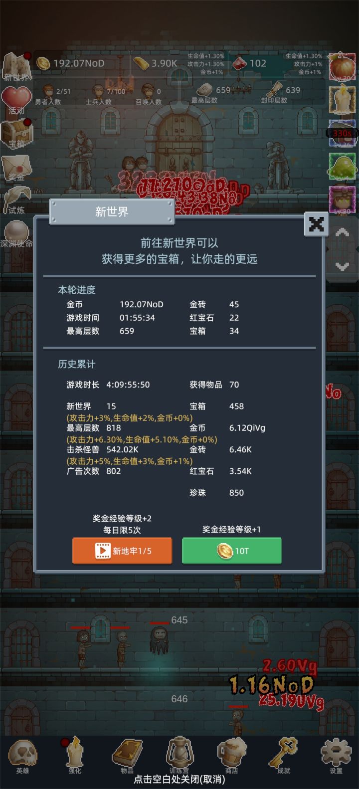 新人进群首看群公告,兑换码搞一搞,tap上分享3次游戏动态-截图私聊群助理,会给你三个正能量兑换码,然后新世界4转再赠送一级,满级。 前期金钻商店买最下面的勇者之赐,每次转生必买!!! 玩法首次爬关100关,金币10T开启新世界(也就是转生),10T金币比较困难,大概在105关时候,商店点金术单位T时候看广告,加