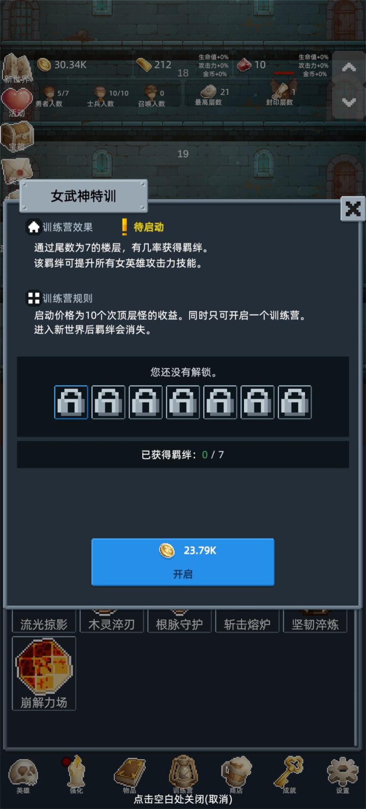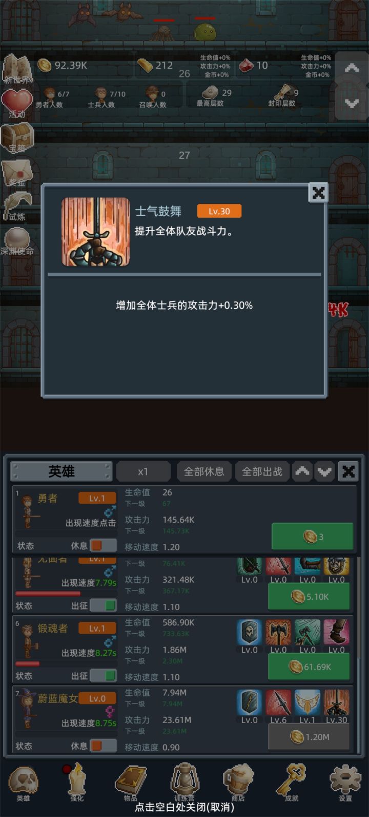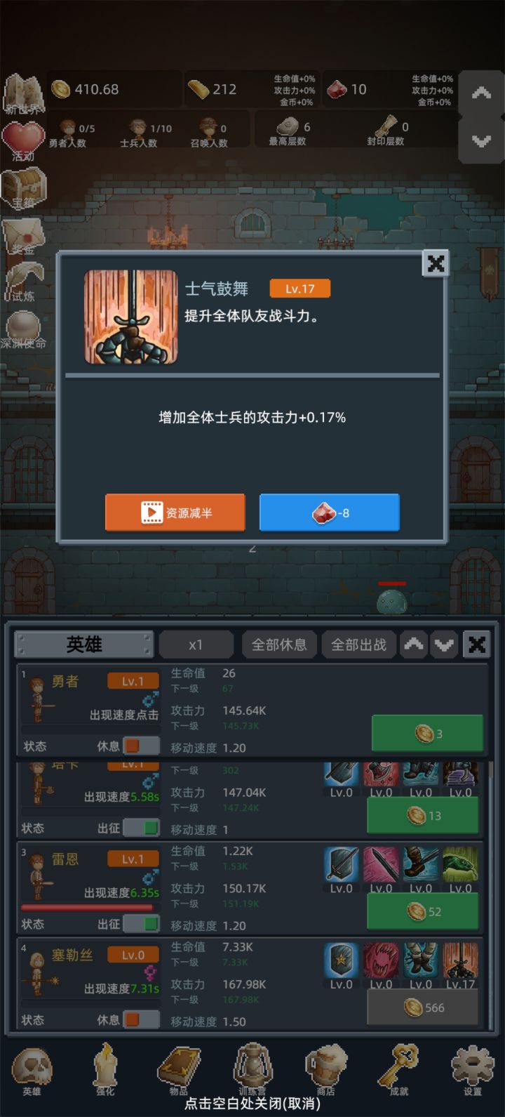 新手起步详细攻略1,先加群,搞兑换码,红宝石主要升级塞勒丝和蔚蓝魔女的4技能(图3,图4),金条用于买商店的勇者之赐(图2)2,金币优先开新兵种,提升大于升级兵种3,第一局先想办法打到100层,然后重置新世界,第二局慢慢苟到150层开试炼,然后就可以开始速刷了。速刷开始,1,手动出勇者,勇者升到5级,金币一够就出新士兵,到勇者不能秒怪为止。2,勇者不能秒怪了,就在商店点出白玲,训练营