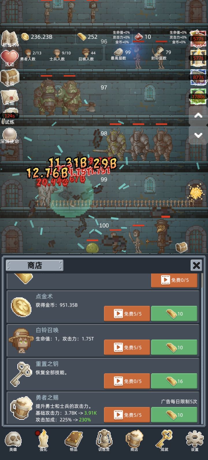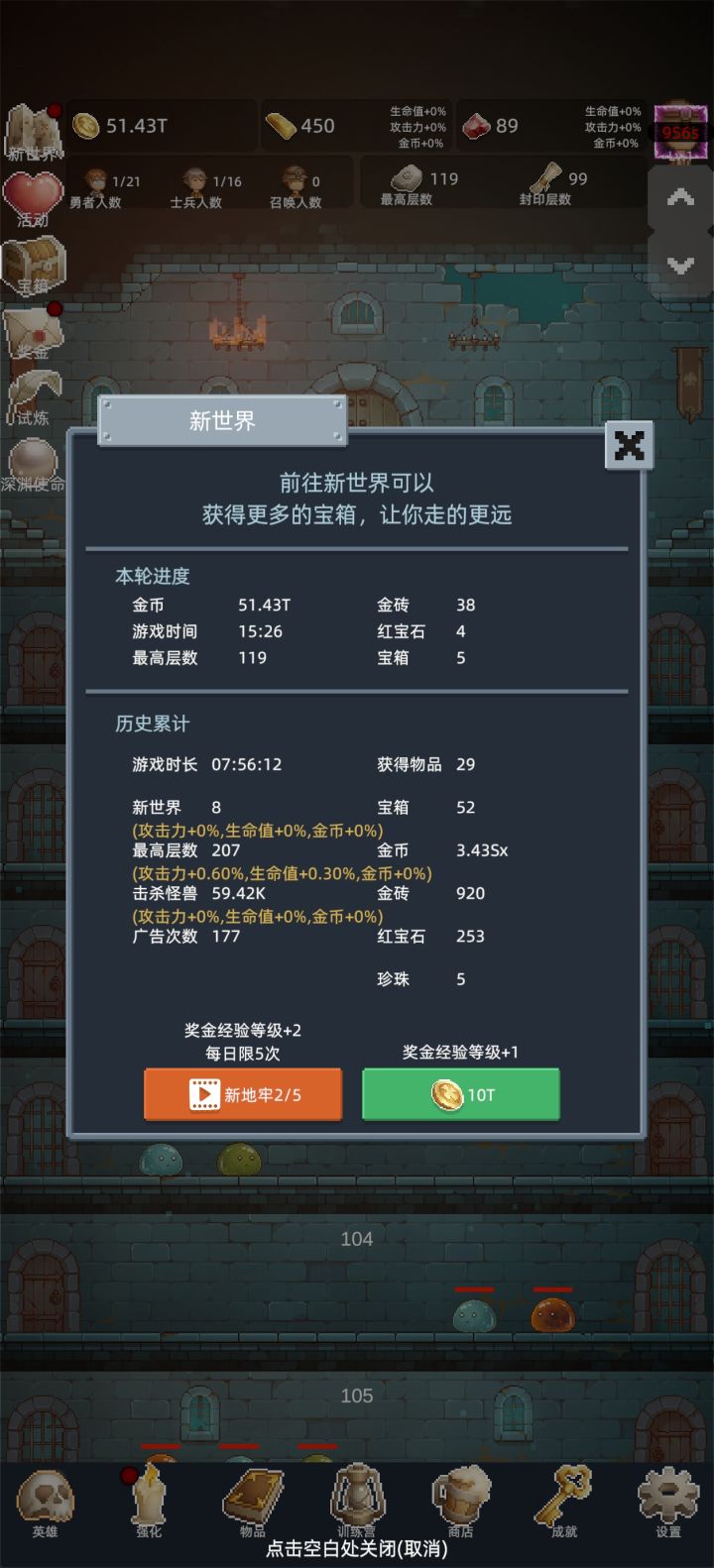 这游戏主要的玩法就是打到100层,然后轮回,中间可以拿到宝箱,记得看广告双倍领,然后继续轮回,直到你认为战力够了,就可以不轮回继续往下打