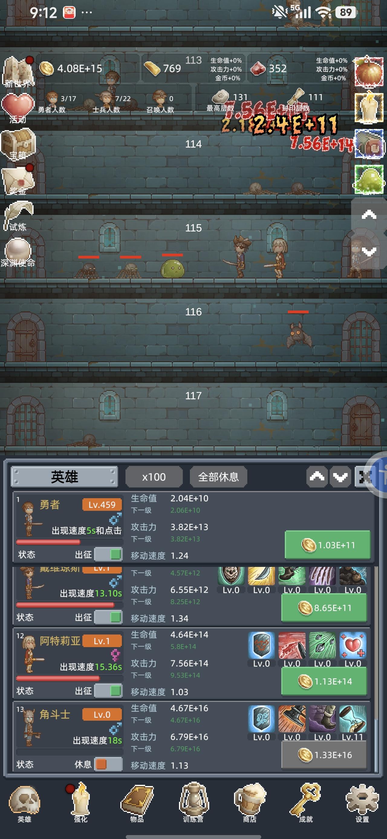 进游戏之后第一件事,把所有能找到的礼包码领了,然后商店购买最下面的勇者之赐,这个东西越多越好,宝石留着升训练营的永久传承,这个需要极多的红宝石。第一次进入打到100层之后凑10T转生,没必要继续打,在转生两三次之后试着打到150,开启试炼。前期大概就是勇者+白玲的打法,开局只升级勇者,用勇者尽量往后推,等勇者的攻击不足把怪物秒杀后开白玲,利用点金术和白玲尽量拿试炼奖励。勇者升级到110之后可