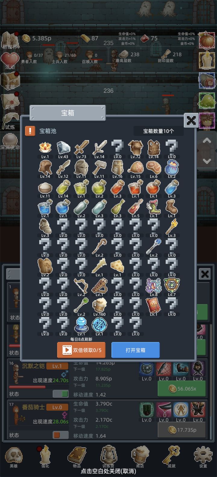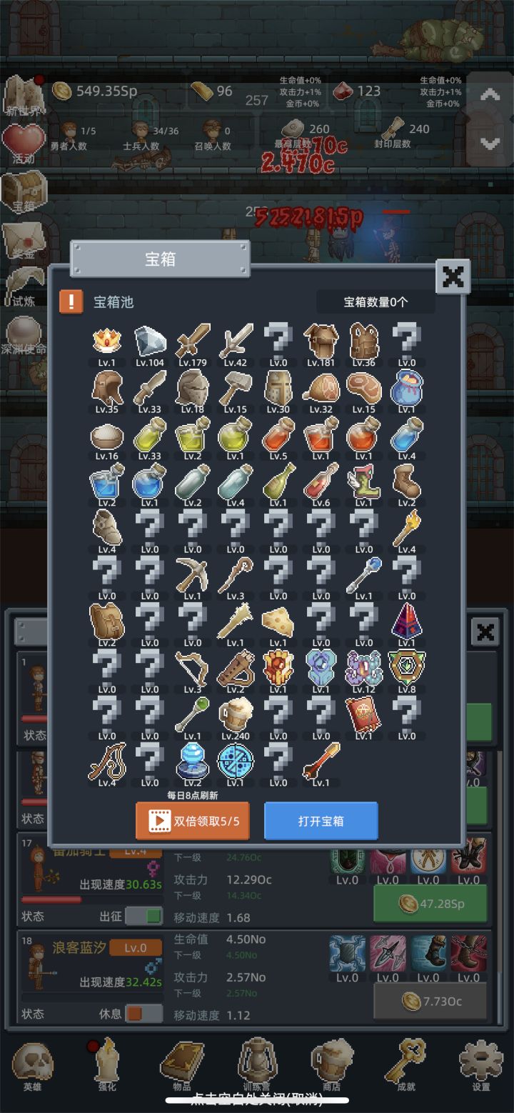 刚进游戏就被复古的像素画风戳中了,地牢的砖墙、像素化的英雄与怪物、宝箱里的装备图标,每一处都透着满满的怀旧感,瞬间把人拉回小时候玩像素游戏的快乐里。最让我惊喜的是放置挂机的核心玩法,完全不用肝:哪怕离线,勇者们也会自动在地牢里闯关、刷怪、攒金币,上线就能收获一堆资源,对上班族和休闲玩家太友好了。哪怕只是挂着,看着勇者人数一点点上涨、最高层数不断刷新,都有种满满的成就感。•装备系统更是亮点满满,