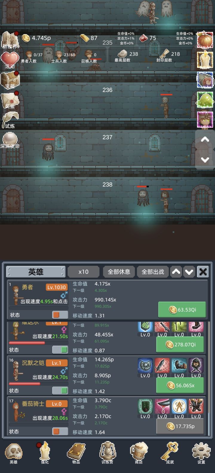 新手起步详细攻略1,先加群,搞兑换码,红宝石主要升级塞勒丝和蔚蓝魔女的4技能(图3,图4),金条用于买商店的勇者之赐(图2)2,金币优先开新兵种,提升大于升级兵种3,第一局先想办法打到100层,然后重置新世界,第二局慢慢苟到150层开试炼,然后就可以开始速刷了。速刷开始,1,手动出勇者,勇者升到5级,金币一够就出新士兵,到勇者不能秒怪为止。2,勇者不能秒怪了,就在商店点出白玲,训练营