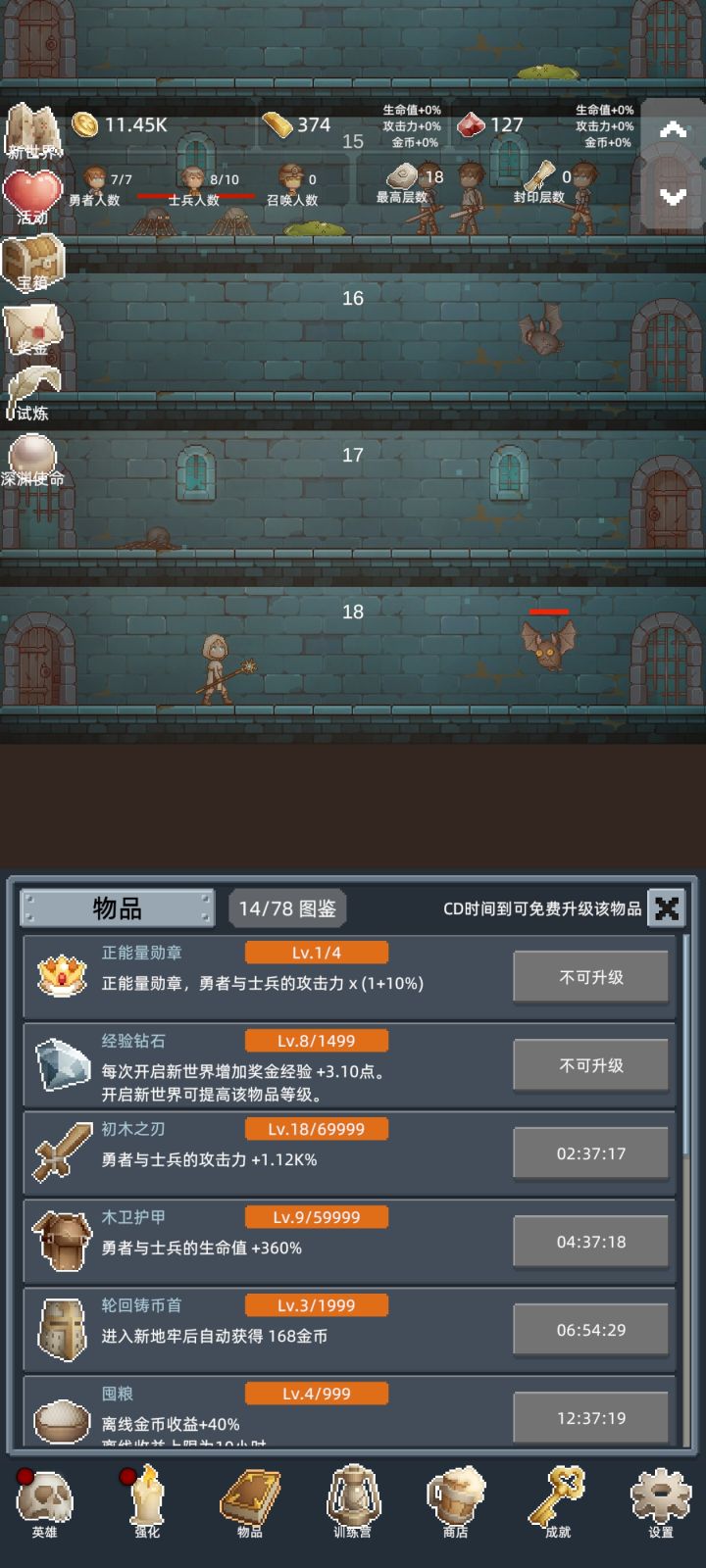 新手起步详细攻略1,先加群,搞兑换码,红宝石主要升级塞勒丝和蔚蓝魔女的4技能(图3,图4),金条用于买商店的勇者之赐(图2)2,金币优先开新兵种,提升大于升级兵种3,第一局先想办法打到100层,然后重置新世界,第二局慢慢苟到150层开试炼,然后就可以开始速刷了。速刷开始,1,手动出勇者,勇者升到5级,金币一够就出新士兵,到勇者不能秒怪为止。2,勇者不能秒怪了,就在商店点出白玲,训练营