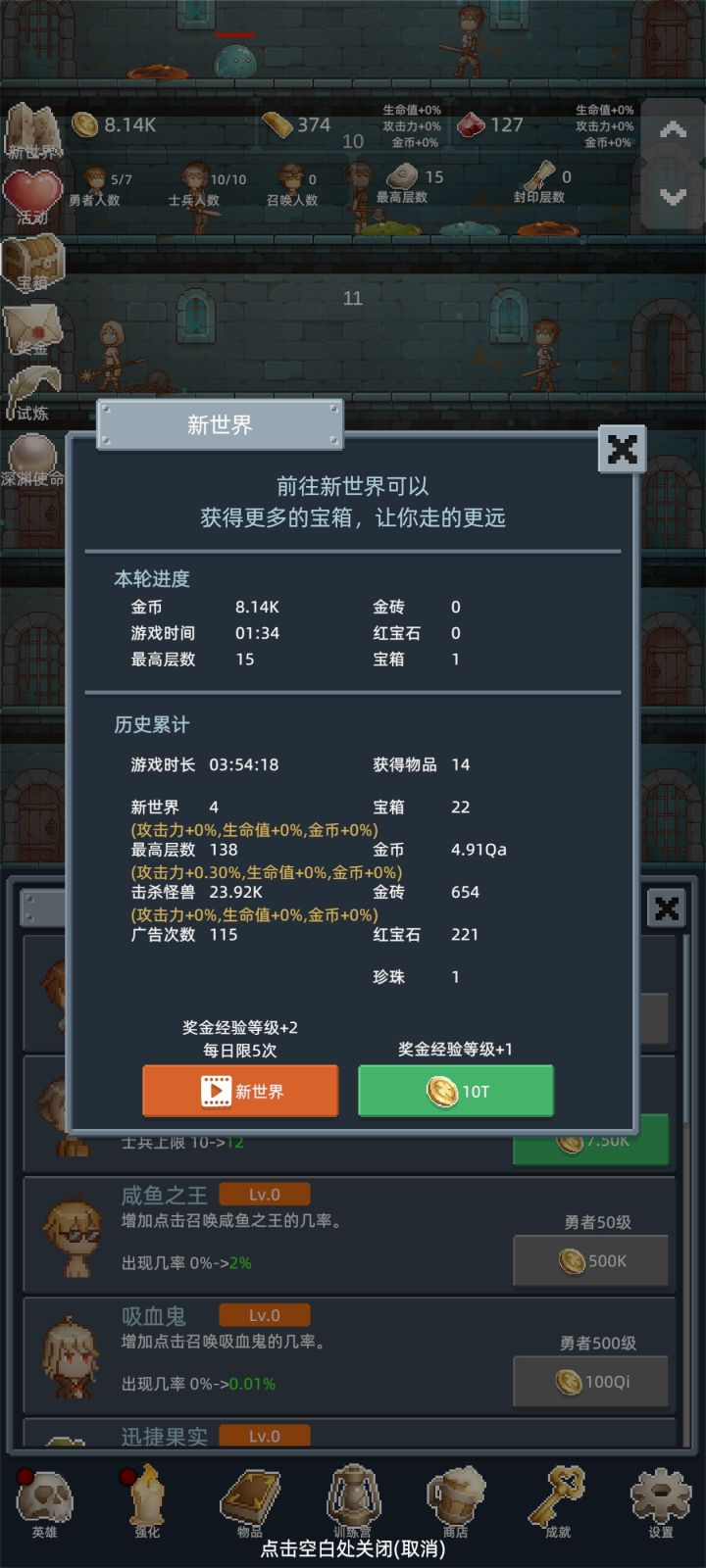 上班摸鱼佳作,手点好玩 在前3次重生前不需要特意升级勇者,开新佣兵推层更快,佣兵可以适当升级,只要升级花费的金币不超过开新佣兵的十分之一就行。 商店加属性的酒买满,其他的冲关时候才建议买。 转生三次后争取刷到150层,之后的每次重生都会开启试炼,在限定的时间内推到目标层数,会有不少奖励。 每个10的倍数层都有几率刷出宝箱,前期就是不停的重生试炼刷宝箱,商店的东西除了加属性的酒,主打一个无限