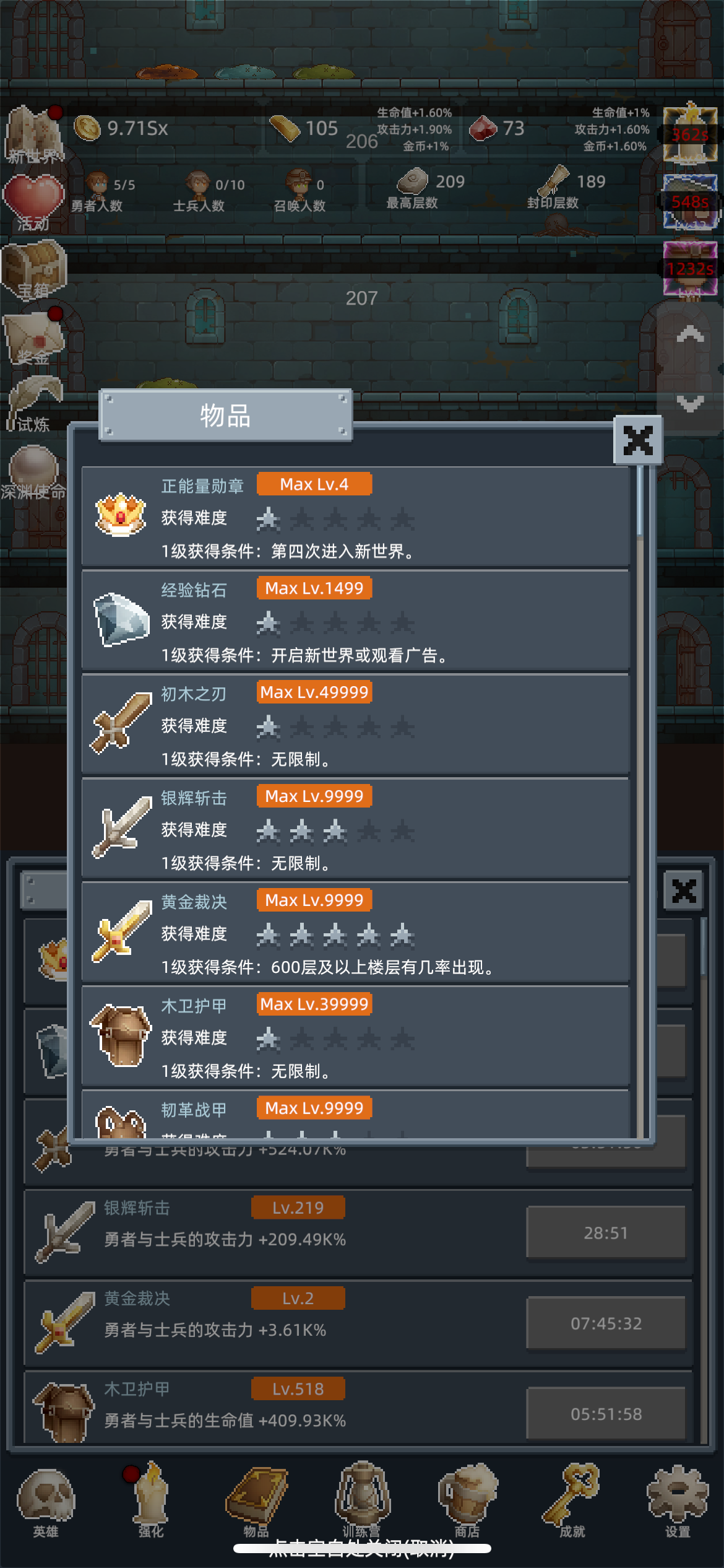游戏没有内购,花点时间看广告就行前期主要是冲层,土兵每个只升一级,不够钱了就升勇士。勇士100级,500级,1000级会有质变。前三次尽量120层了再转生。可以多个120层的宝箱。第三次了尽量打到150层,可以开试炼。每次转生商店都会重置,利用好冲层有大用。勇者之赐无脑升满!!!