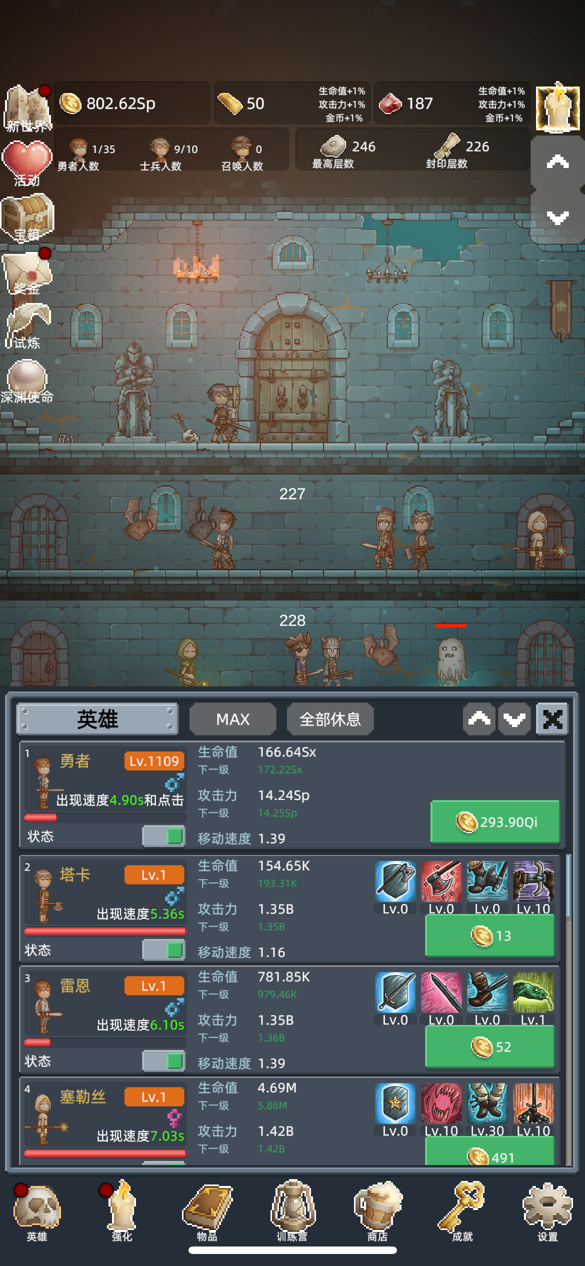 游戏没有内购,花点时间看广告就行前期主要是冲层,土兵每个只升一级,不够钱了就升勇士。勇士100级,500级,1000级会有质变。前三次尽量120层了再转生。可以多个120层的宝箱。第三次了尽量打到150层,可以开试炼。每次转生商店都会重置,利用好冲层有大用。勇者之赐无脑升满!!!
