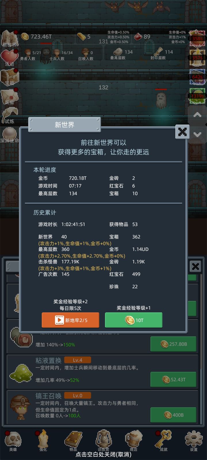 新手起步详细攻略1,先加群,搞兑换码,红宝石主要升级塞勒丝和蔚蓝魔女的4技能(图3,图4),金条用于买商店的勇者之赐(图2)2,金币优先开新兵种,提升大于升级兵种3,第一局先想办法打到100层,然后重置新世界,第二局慢慢苟到150层开试炼,然后就可以开始速刷了。速刷开始,1,手动出勇者,勇者升到5级,金币一够就出新士兵,到勇者不能秒怪为止。2,勇者不能秒怪了,就在商店点出白玲,训练营