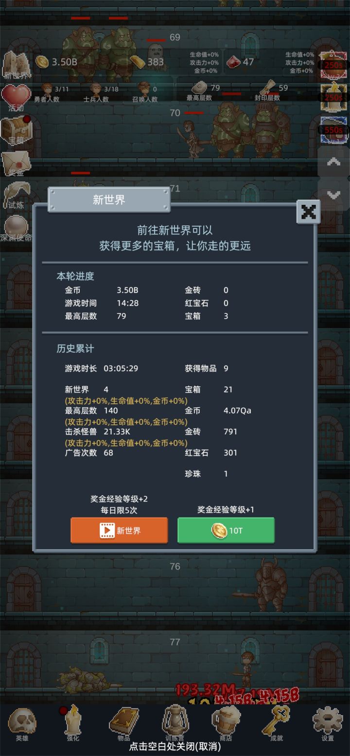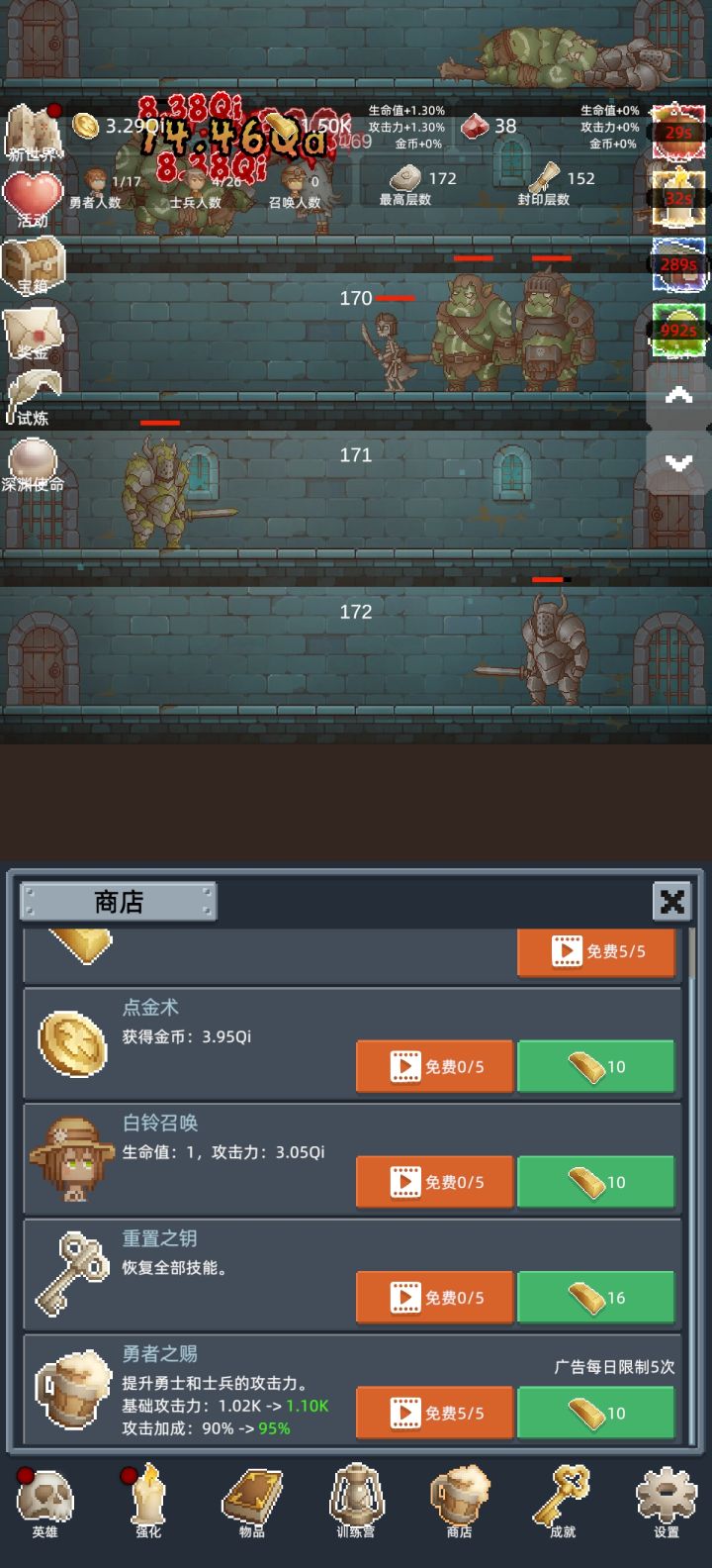 上班摸鱼佳作,手点好玩 在前3次重生前不需要特意升级勇者,开新佣兵推层更快,佣兵可以适当升级,只要升级花费的金币不超过开新佣兵的十分之一就行。 商店加属性的酒买满,其他的冲关时候才建议买。 转生三次后争取刷到150层,之后的每次重生都会开启试炼,在限定的时间内推到目标层数,会有不少奖励。 每个10的倍数层都有几率刷出宝箱,前期就是不停的重生试炼刷宝箱,商店的东西除了加属性的酒,主打一个无限