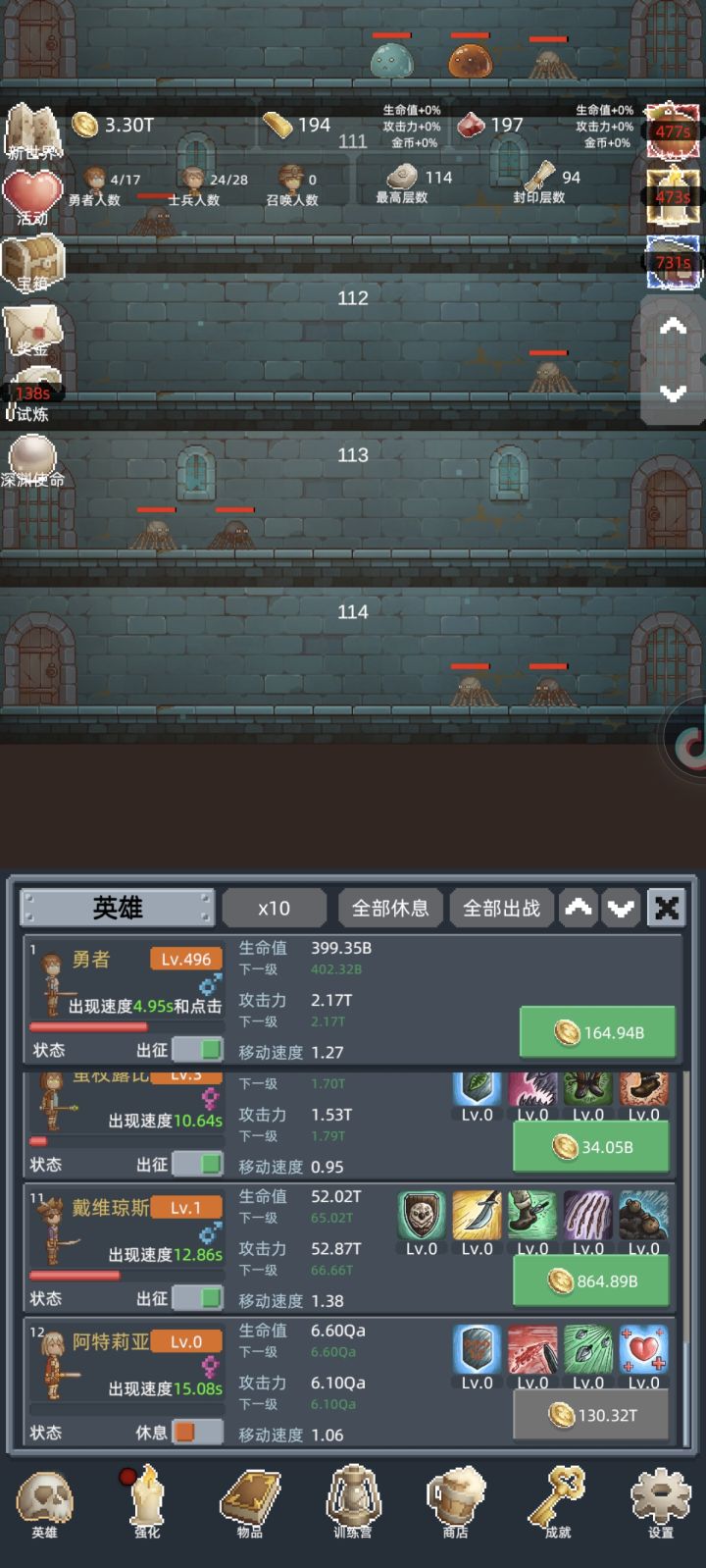 上头神作,界面简单。在前3次重生前不需要特意升级勇者,开新佣兵推层更快,佣兵可以适当升级,只要升级花费的金币不超过开新佣兵的十分之一就行。
