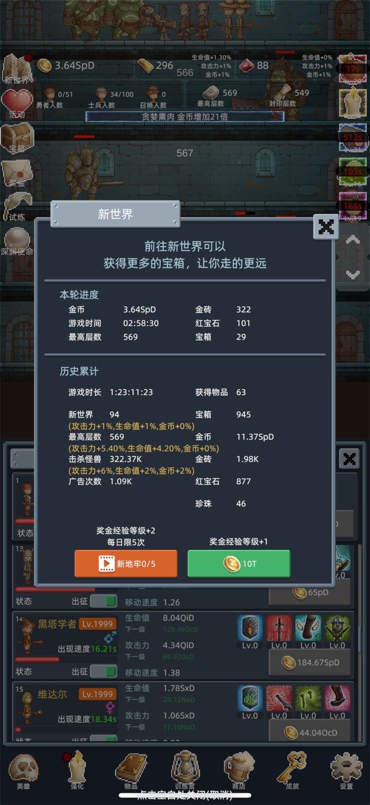 对于佛系玩家来说这个游戏一点焦虑都没有,甚至可以不看广告(方法可以进群或者别人帖子看看)。第一轮过程会比较慢,有一点点提升走向至强的感觉。如果你想进展快一点,每天记得把商店里的酒吃满五次广告,对于刚下载游玩来说提升比其它都明显一点。到了我这样的中期,佛系玩家可以选择冲一冲塔层数,一般不建议直接到300层,最好250层拿完后就可以随缘刷新了。