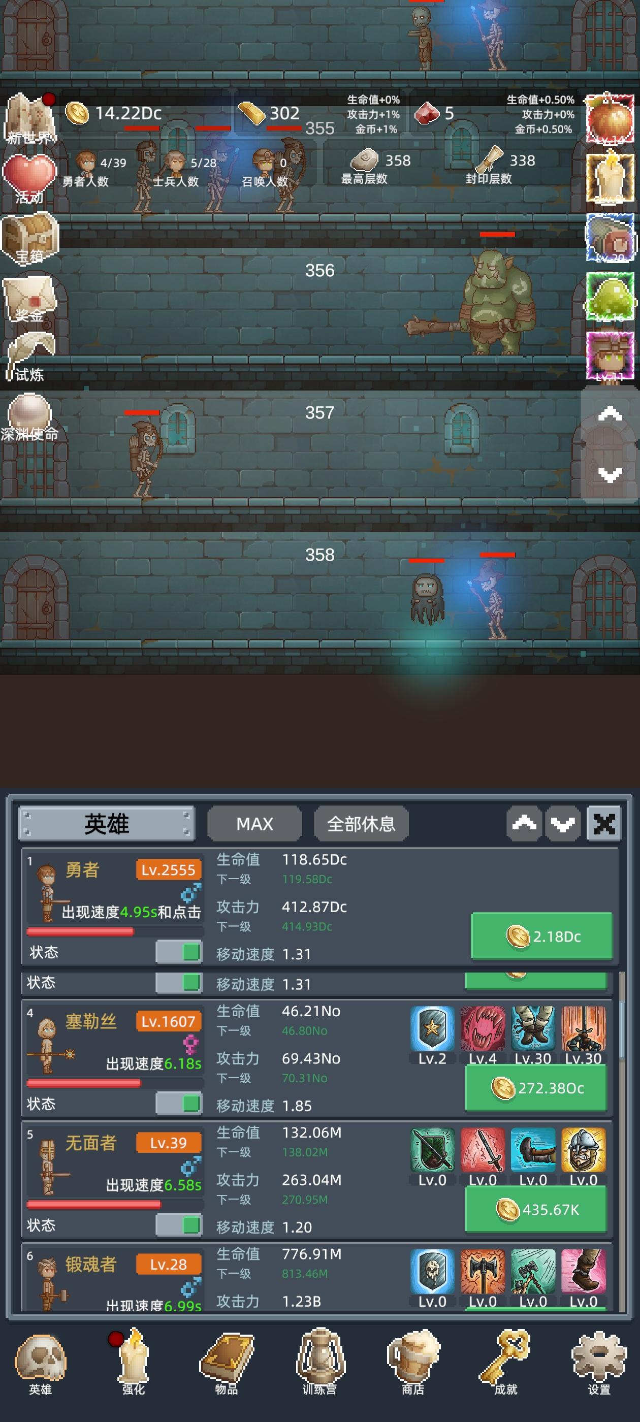 进游戏之后第一件事,把所有能找到的礼包码领了,然后商店购买最下面的勇者之赐,这个东西越多越好,宝石留着升训练营的永久传承,这个需要极多的红宝石。第一次进入打到100层之后凑10T转生,没必要继续打,在转生两三次之后试着打到150,开启试炼。前期大概就是勇者+白玲的打法,开局只升级勇者,用勇者尽量往后推,等勇者的攻击不足把怪物秒杀后开白玲,利用点金术和白玲尽量拿试炼奖励。勇者升级到110之后可