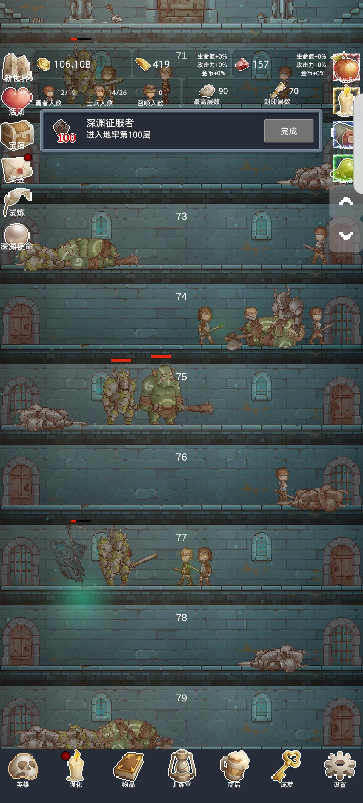 游戏没有内购,花点时间看广告就行 可以立马取消拿奖励,前期主要是冲层,土兵每个只升一级,不够钱了就升勇士。勇士100级,500级,1000级会有质变。 前三次尽量120层了再转生。可以多个120层的宝箱。第三次了尽量打到150层,可以开试炼。每次转生商店都会重置,利用好冲层有大用。勇者之赐无脑升满!!!