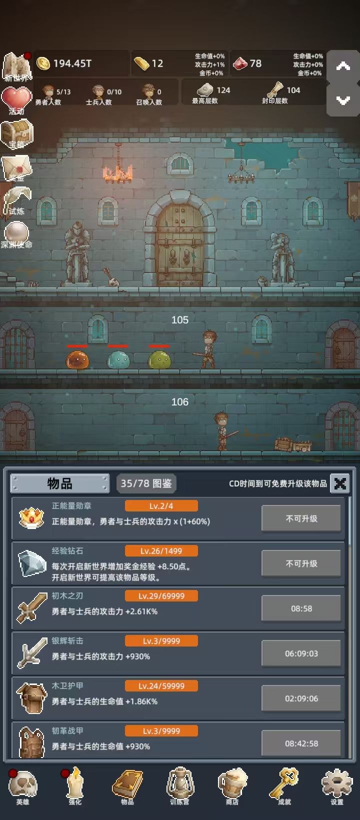 #发现好游戏 刷到100层立马进新世界,转几次以后开试炼,然后就慢慢刷红宝石,记得每天过一百层后到深渊领珍珠,然后就慢慢刷,士兵过了1000后攻击力会大幅提升,但是要好多钱,后期我就主升勇士了,感觉花的钱比士兵少,而且有一层层推的快感。