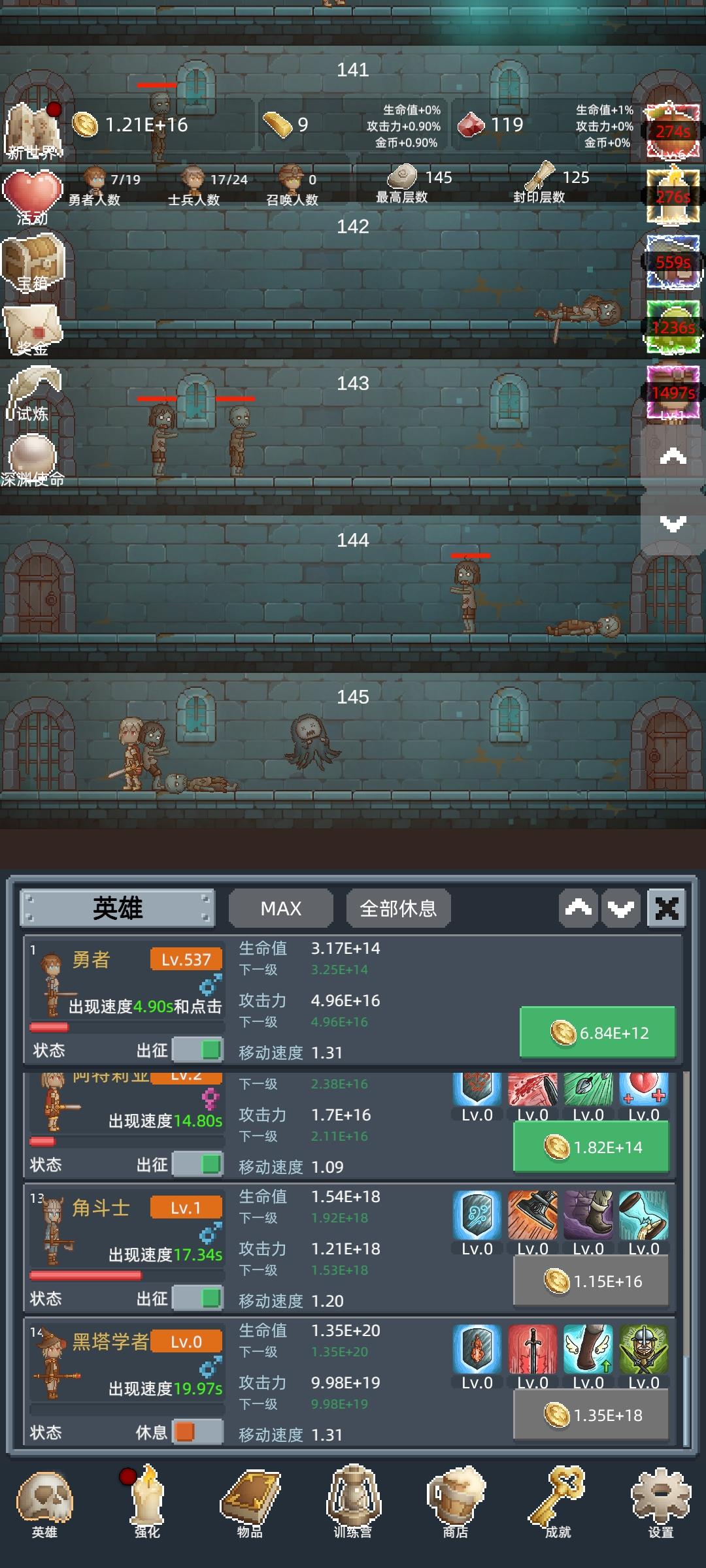 这游戏好玩的,一口气玩了好久,简单分享一下自己的想法。左上角信封的广告奖励尽量拿完,每次进新世界可以在商店升级5次勇者之赐,加属性的,需要用金砖。金砖用来升勇者之赐就行。金币的花费我是除了开新士兵之外,主要升级勇者。点出强化里的战阵结晶之后,勇者能高频率召唤,主要推层就靠这个。