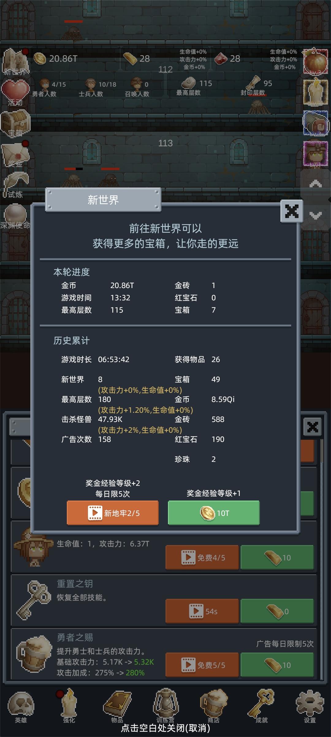 游戏没有内购,实在良心,广告可以立马取消拿奖励。 前期主要是冲层,士兵每个只升一级。尽量120层了再转生。可以多个120层的宝箱。第三次了尽量打到150层。 每次试炼转生都会重置,利用好冲层有大用。 勇者之赐无脑升满!!!