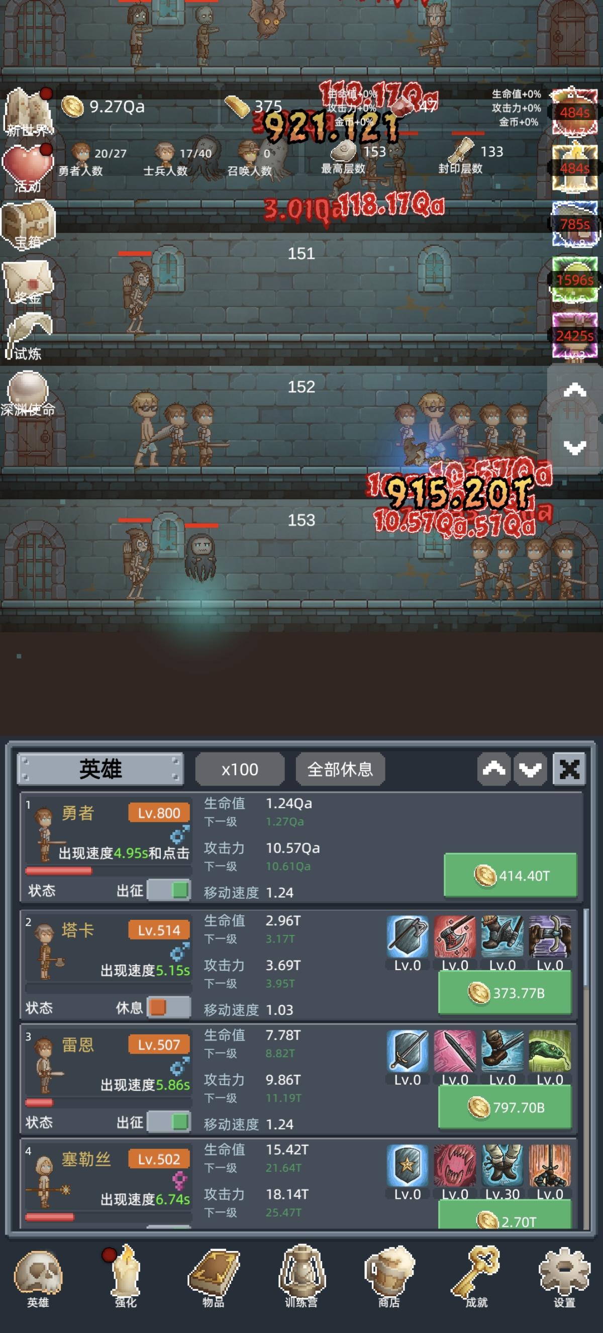 进游戏之后第一件事,把所有能找到的礼包码领了,然后商店购买最下面的勇者之赐,这个东西越多越好,宝石留着升训练营的永久传承,这个需要极多的红宝石。 第一次进入打到100层之后凑10T转生,没必要继续打,在转生两三次之后试着打到150,开启试炼。 前期大概就是勇者+白玲的打法,开局只升级勇者,用勇者尽量往后推,等勇者的攻击不足把怪物秒杀后开白玲,利用点金术和白玲尽量拿试炼奖励。 勇者升级到110