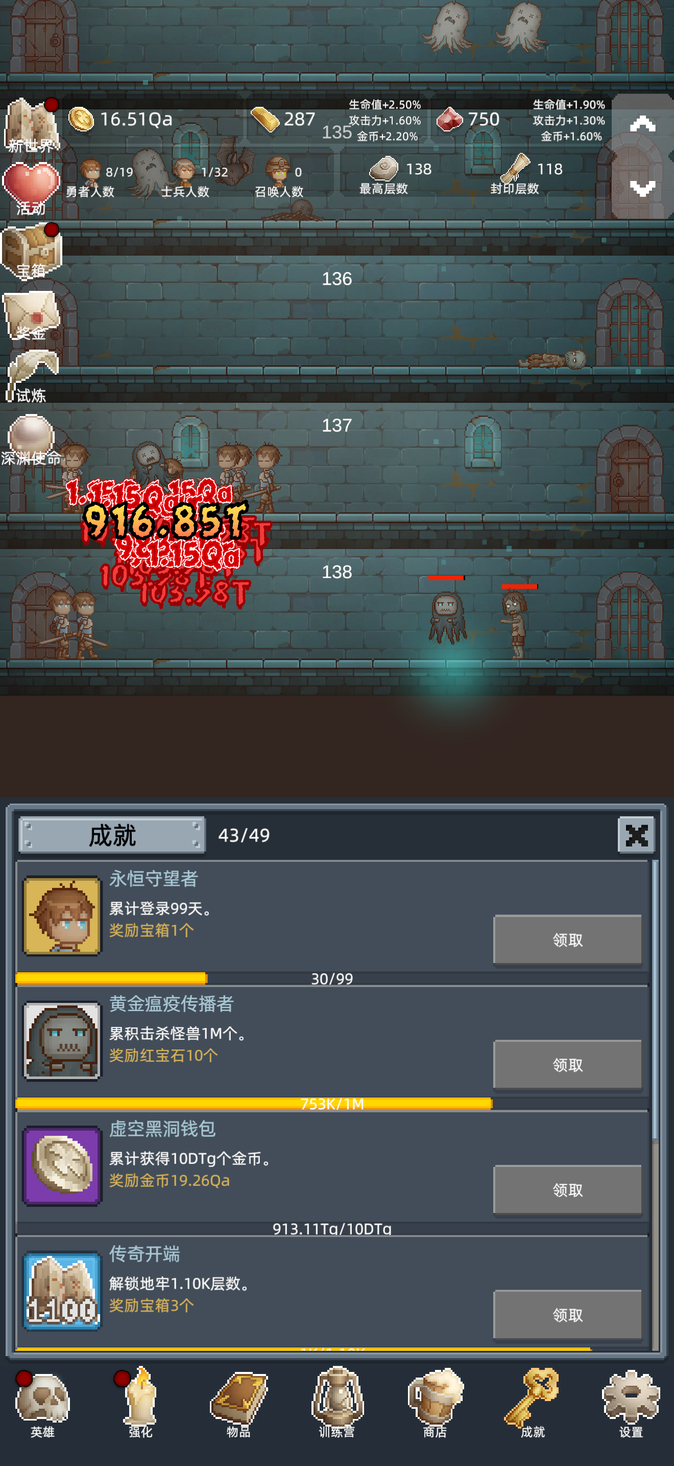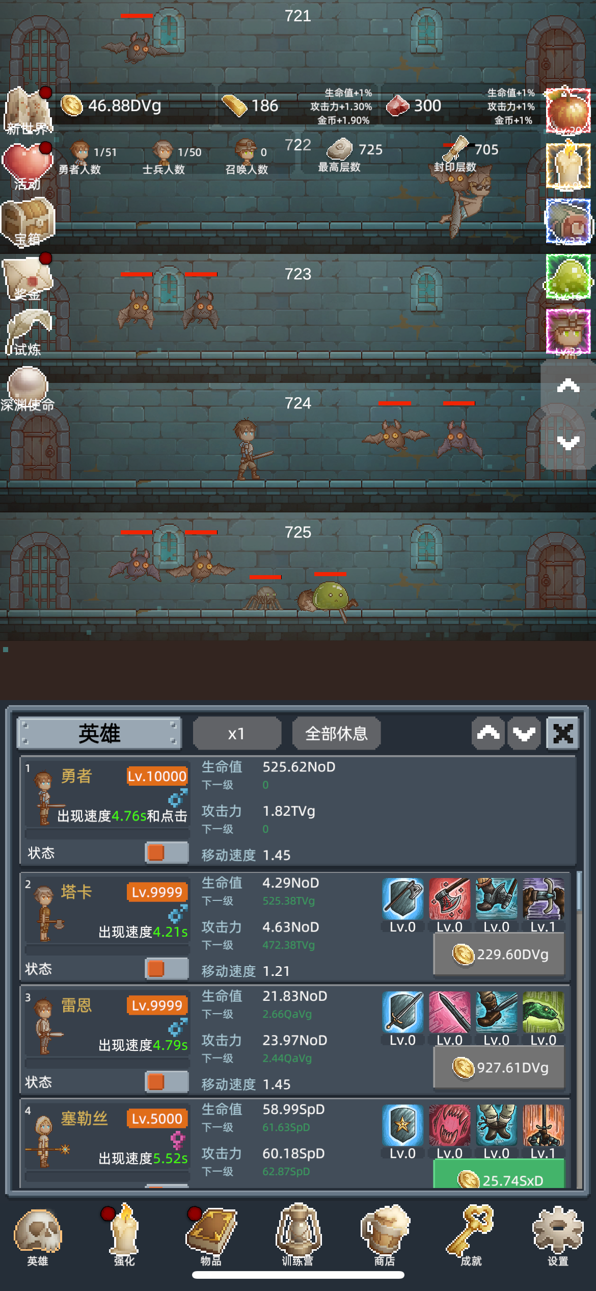 核心原则:拒绝熬关,短平快转生 新手最容易踩的坑就是死磕关卡,其实游戏核心玩法是“转生叠buff”:每轮转生控制在30-55分钟,比硬磨105关效率高10倍 。前3转不用追求高层数,100-105关攒够10T金币就直接转生,重点拿“勇者恩赐”的永久属性加成,越转战力越猛。
