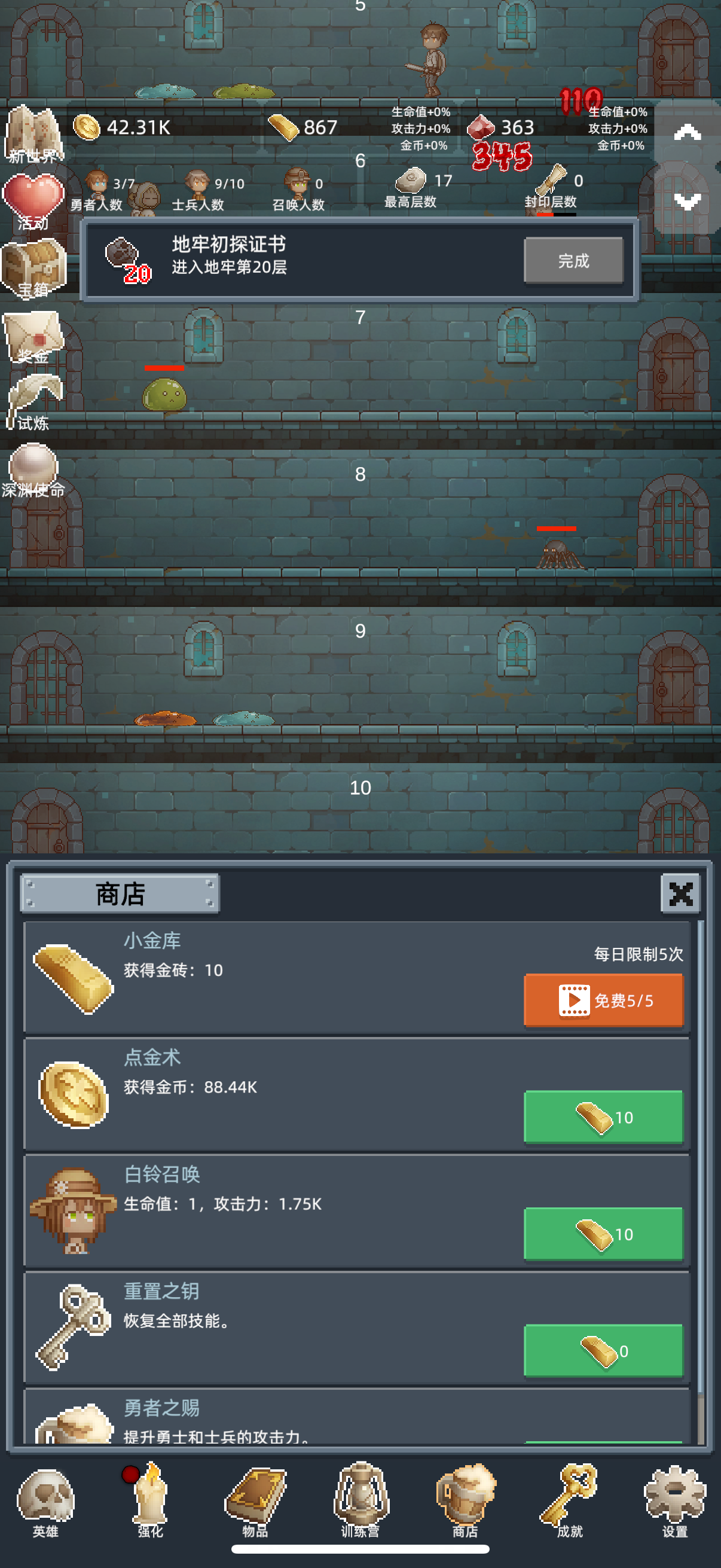 前期还是主要靠勇士流推,思路就是解锁新士兵+升勇士等级,比如解锁2-14号士兵各一级,同时勇士解锁到1000级这种,不过前期一般很难满试炼,尽力而为