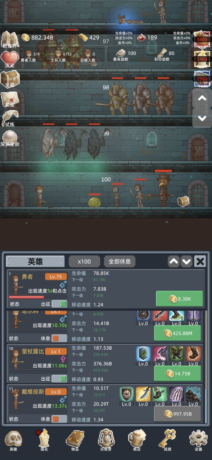 入坑第一天建议,金砖买酒,红石头先不用,留着升级第四个士兵的速度,然后其他三技能,150层之后试炼刷红石头需要速刷