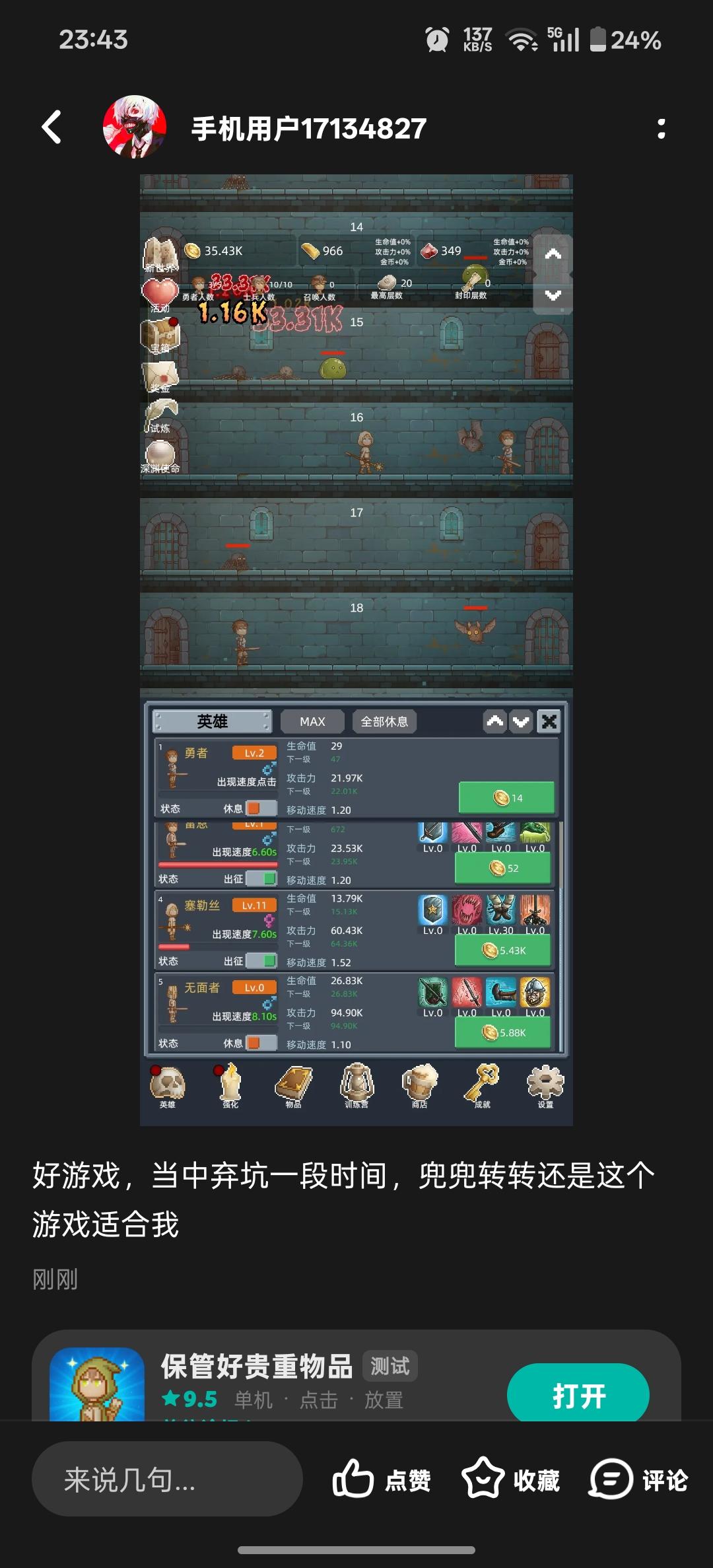 核心原则:拒绝熬关,短平快转生 新手最容易踩的坑就是死磕关卡,其实游戏核心玩法是“转生叠buff”:每轮转生控制在30-55分钟,比硬磨105关效率高10倍 。前3转不用追求高层数,100-105关攒够10T金币就直接转生,重点拿“勇者恩赐”的永久属性加成,越转战力越猛。
