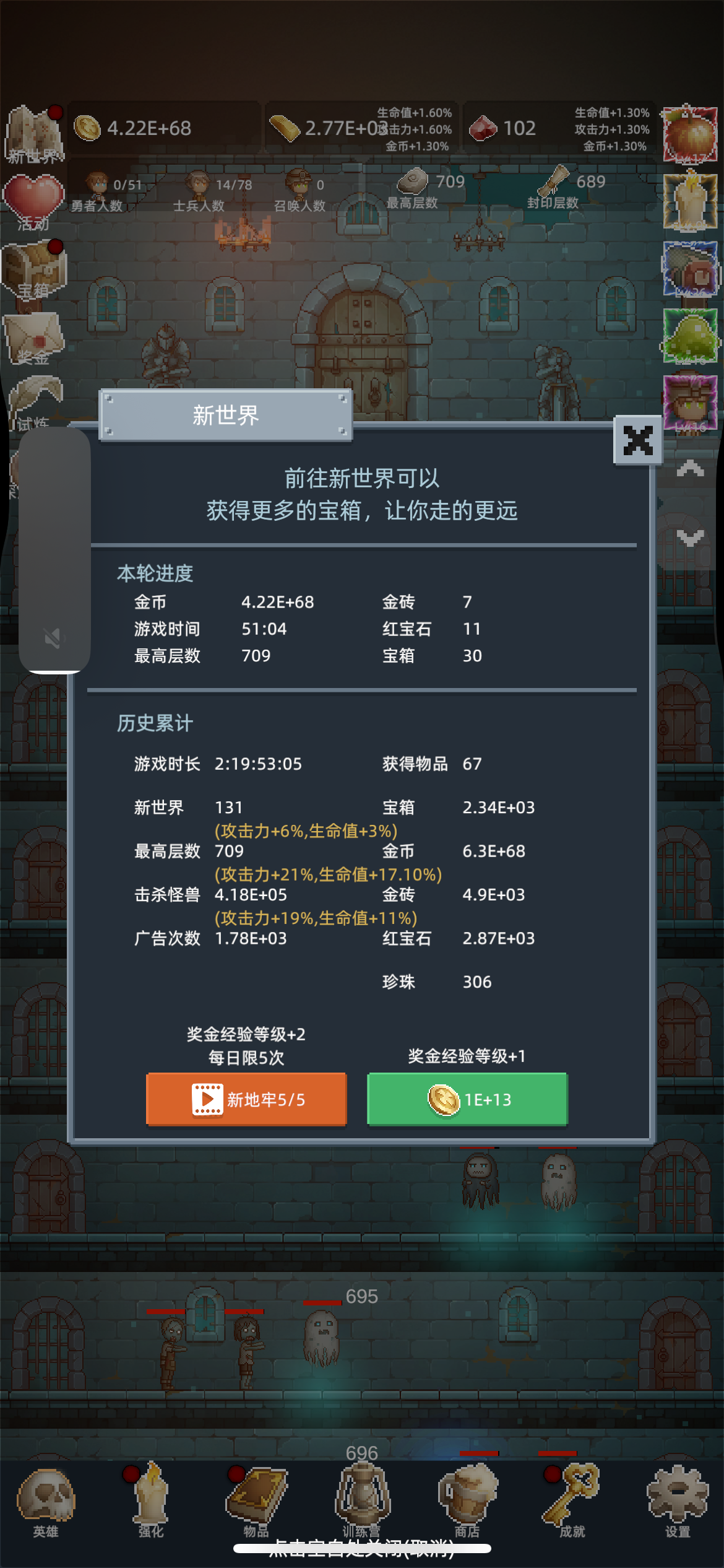 玩了差不多一个礼拜了,因为一直在刷转生,单局时间大概也就十分钟左右,但是真的很上头前期转生个4-5次后刷到150层开启试炼后 在试炼的时间内把商店的刷技能 召兵 点金术用完以快速达到试炼层数拿奖励快速拿到资源转生堆属性