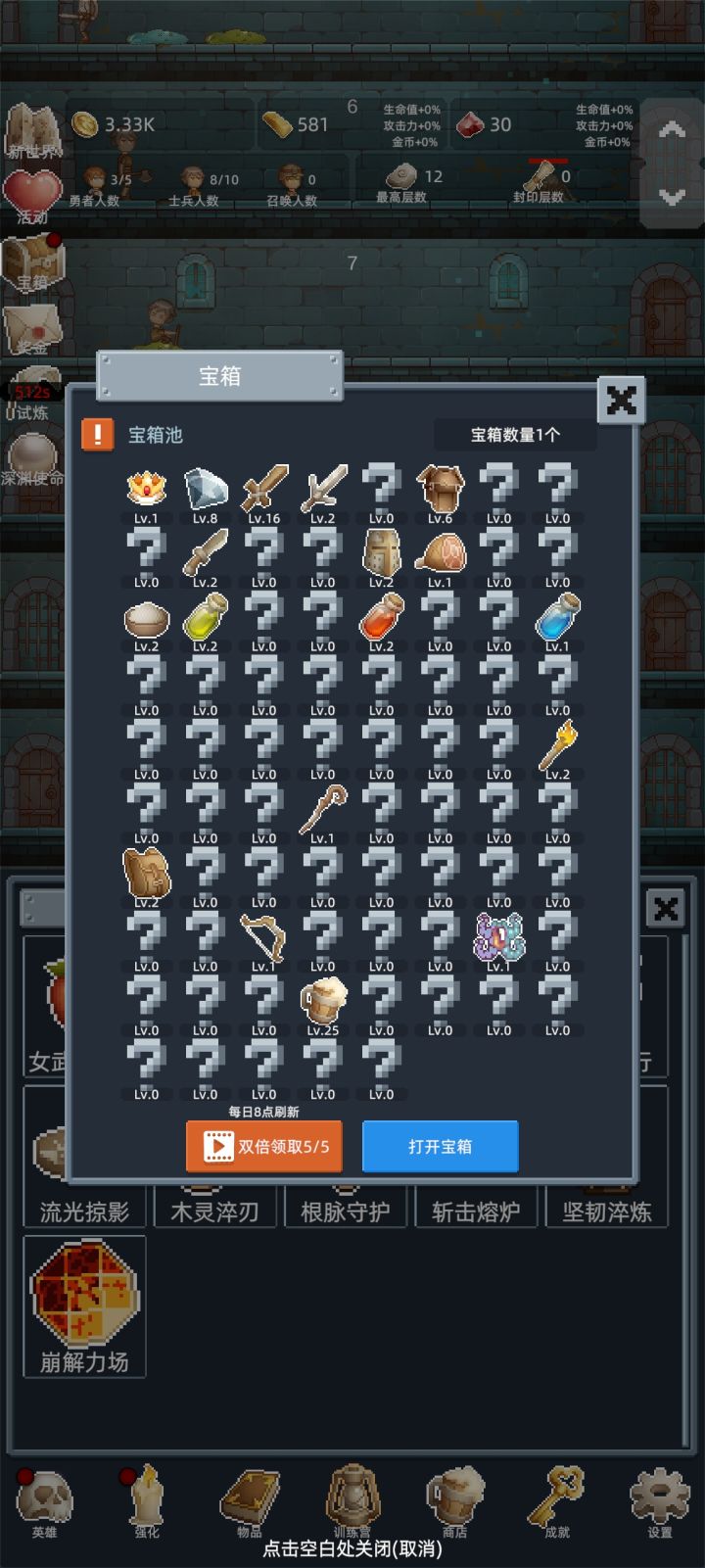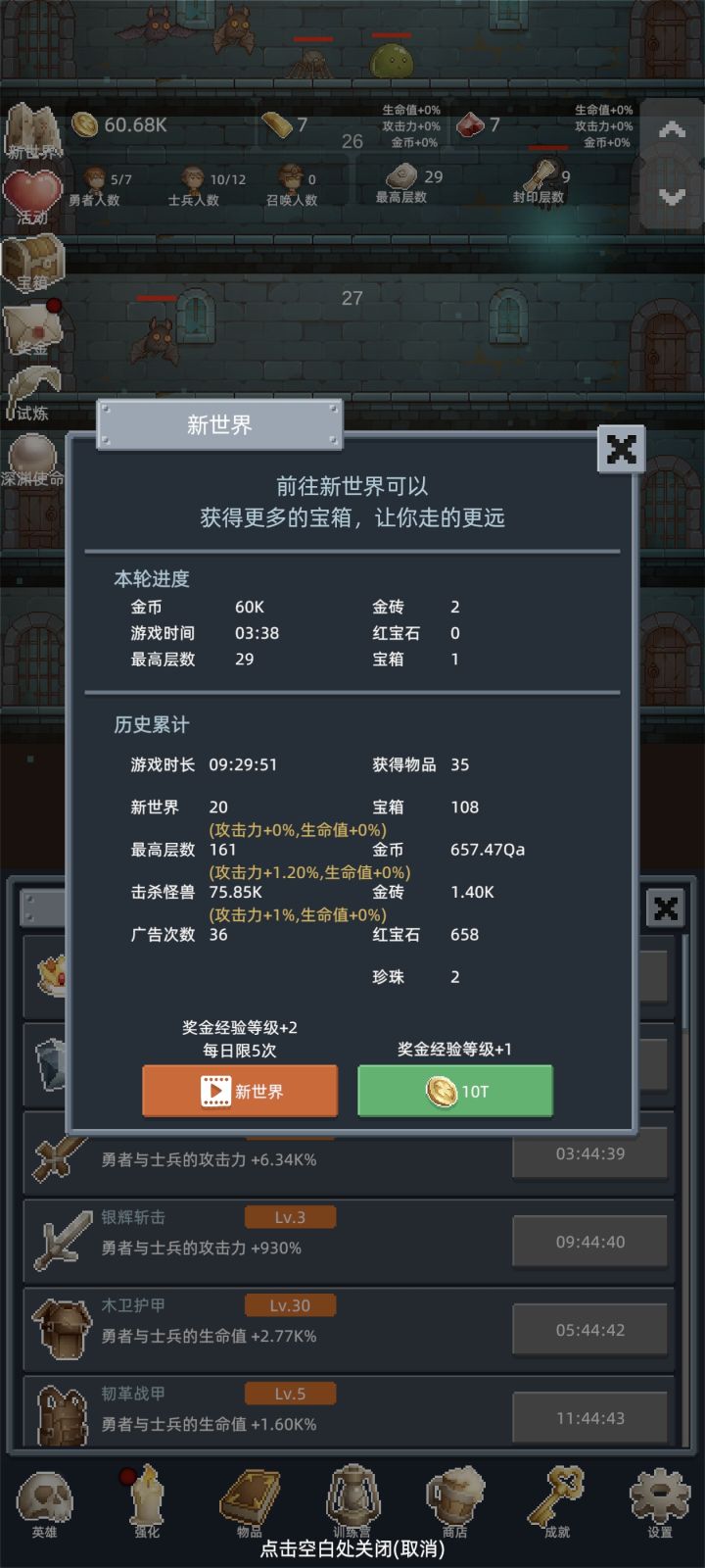 入坑第一天建议,金砖买酒,红石头先不用,留着升级第四个士兵的速度,然后其他三技能,150层之后试炼刷红石头需要速刷